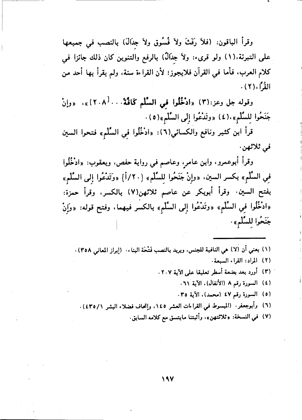 وقرأ أبو عمرو، وابن عامرٍ وعاصم في رواية حفص، ويعقوب: (ادْخُلُوا فِي السِّلْمِ) بكسر السين، (وَإِنْ جَنَحُوا لِلسَّلْمِ) ، (وَتَدْعُوا إِلَى السَّلْمِ)