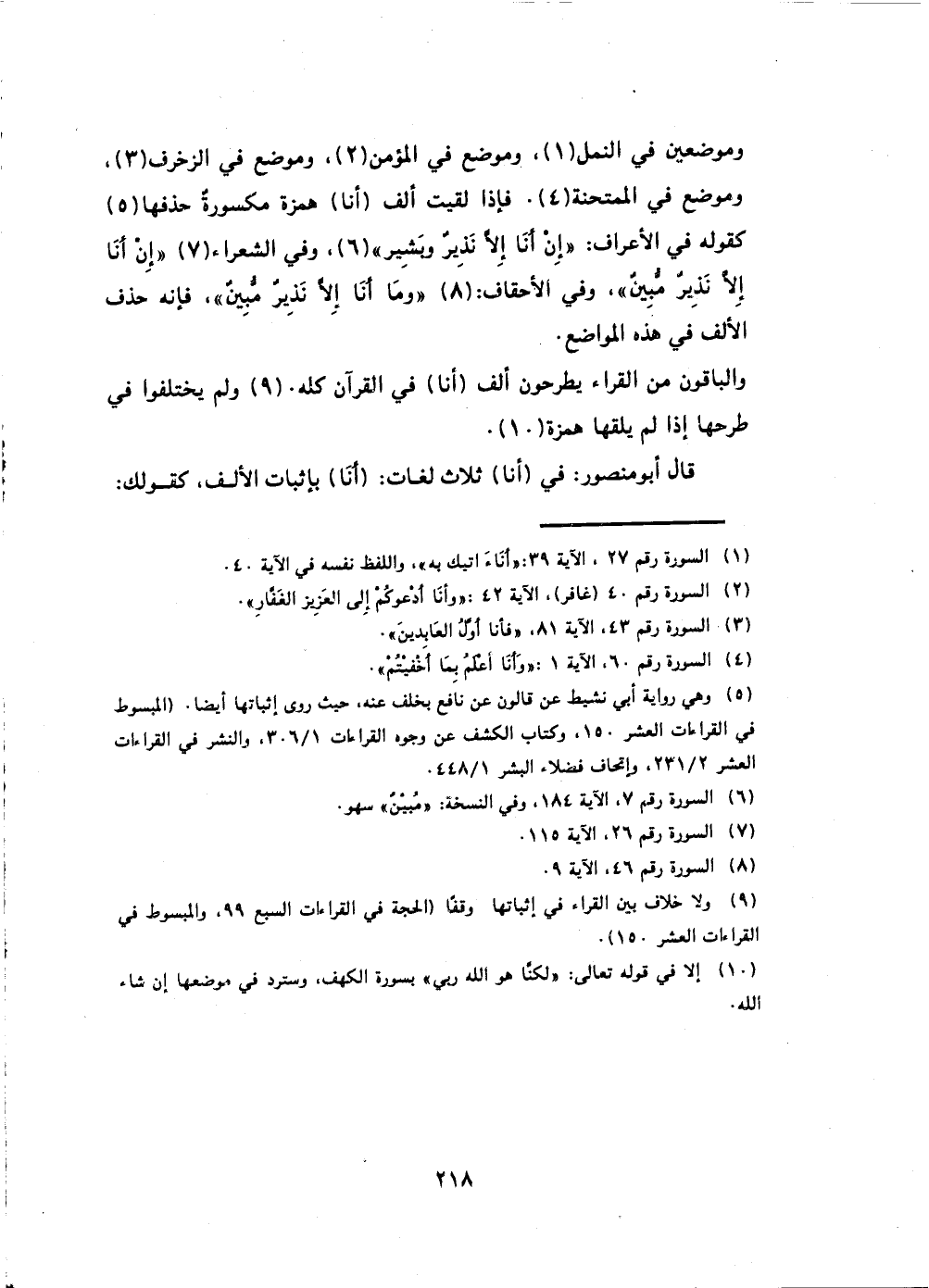 فإذا لقيت ألف (أنا) همزة مكسورة حذفها كقوله في الأعراف: (إِنْ أنَا إِلا نَذِير وبَشِير) ، وفي الشعراء (إِن أنَا إلِا نَذِير مبِين) ،