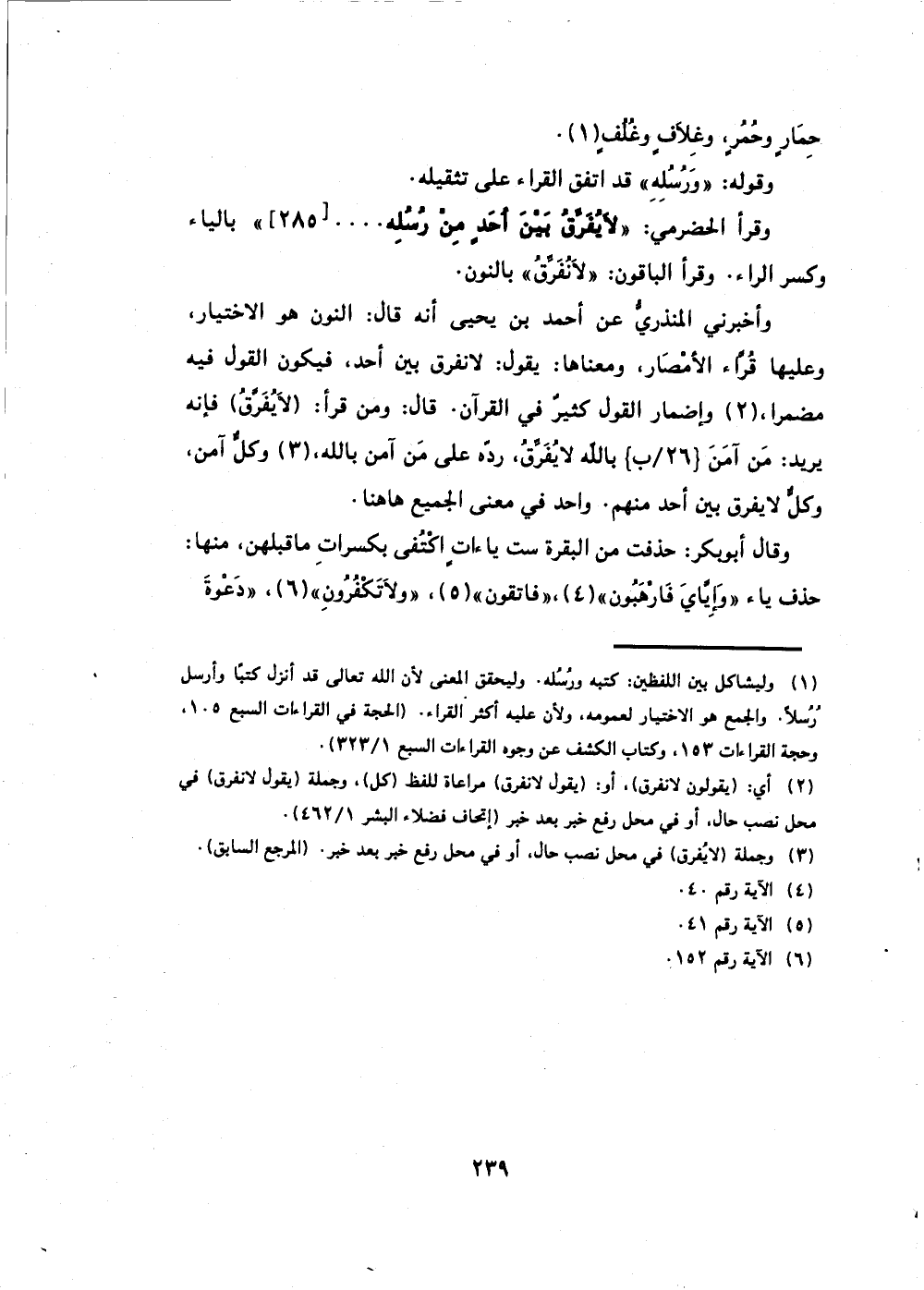 قال: وَمَنْ قَرَأَ: (لَا يُفَرِّقُ) فإنه يريد: مَن آمَنَ بالله لَا يُفَرِّقُ، ردَّه على مَن آمن بالله، وكلٌّ آمن، وكلٌّ لَا يُفَرِّقُ بين أحد منهم.