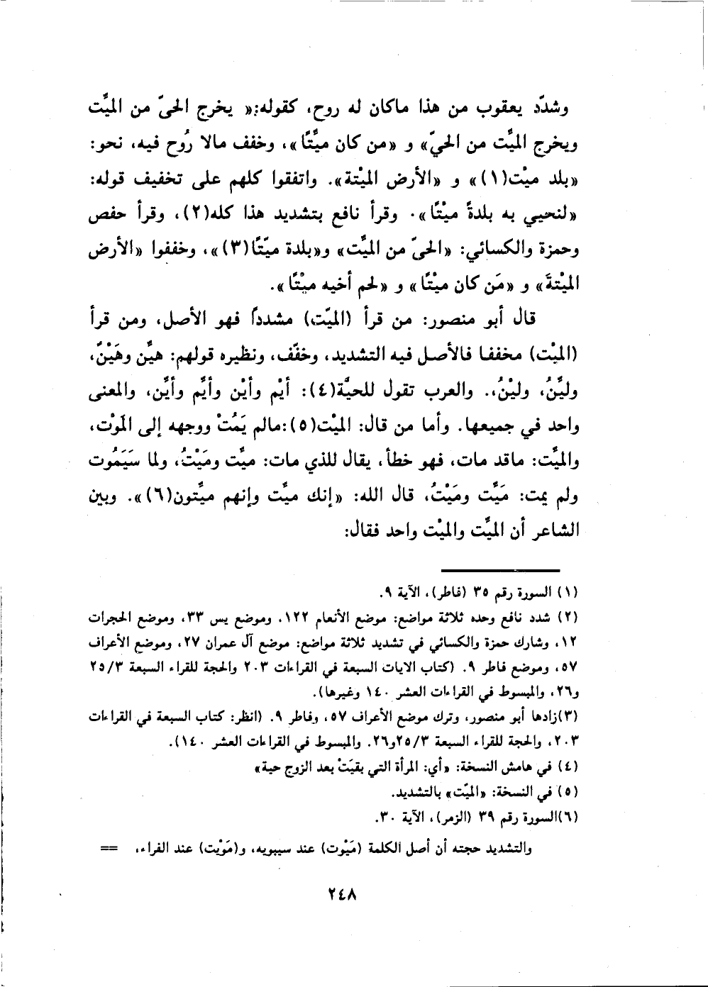 وشدَّد يعقوب من هذا ما كان له روح، كقوله: (يُخْرِجُ الْحَيَّ مِنَ الْمَيِّتِ وَيُخْرِجُ الْمَيِّتَ مِنَ الْحَيِّ) و ((أَوَمَنْ كَانَ مَيِّتًا) ، وخفف ما لا رُوح فيه، نحو: (لِبَلَدٍ مَيْتٍ) و (الْأَرْضُ الْمَيْتَةُ) .