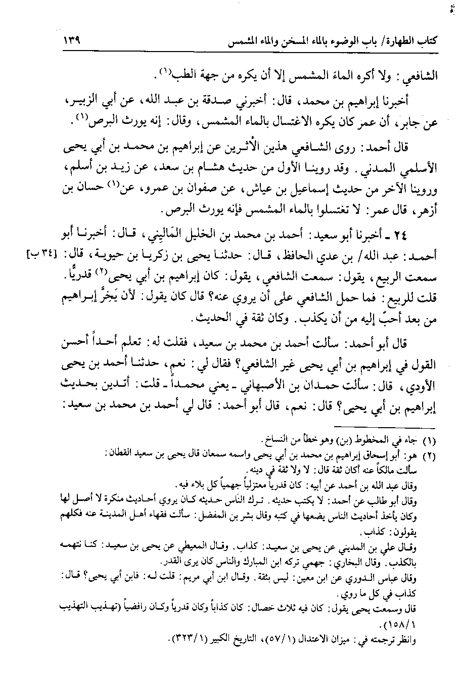 قال أحمد : روى الشافعي هذين الأثرين عن إبراهيم بن محمد بن أبي يحيى الأسلمي المدني . وقد روينا الأول من حديث هشام بن سعد ، عن زيد بن أسلم ، وروينا الآخر من حديث إسماعيل بن عياش ، عن صفوان بن عمرو ، عن حسان بن أزهر ، قال عمر : لا تغتسلوا بالماء المشمس فإنه يورث البرص.