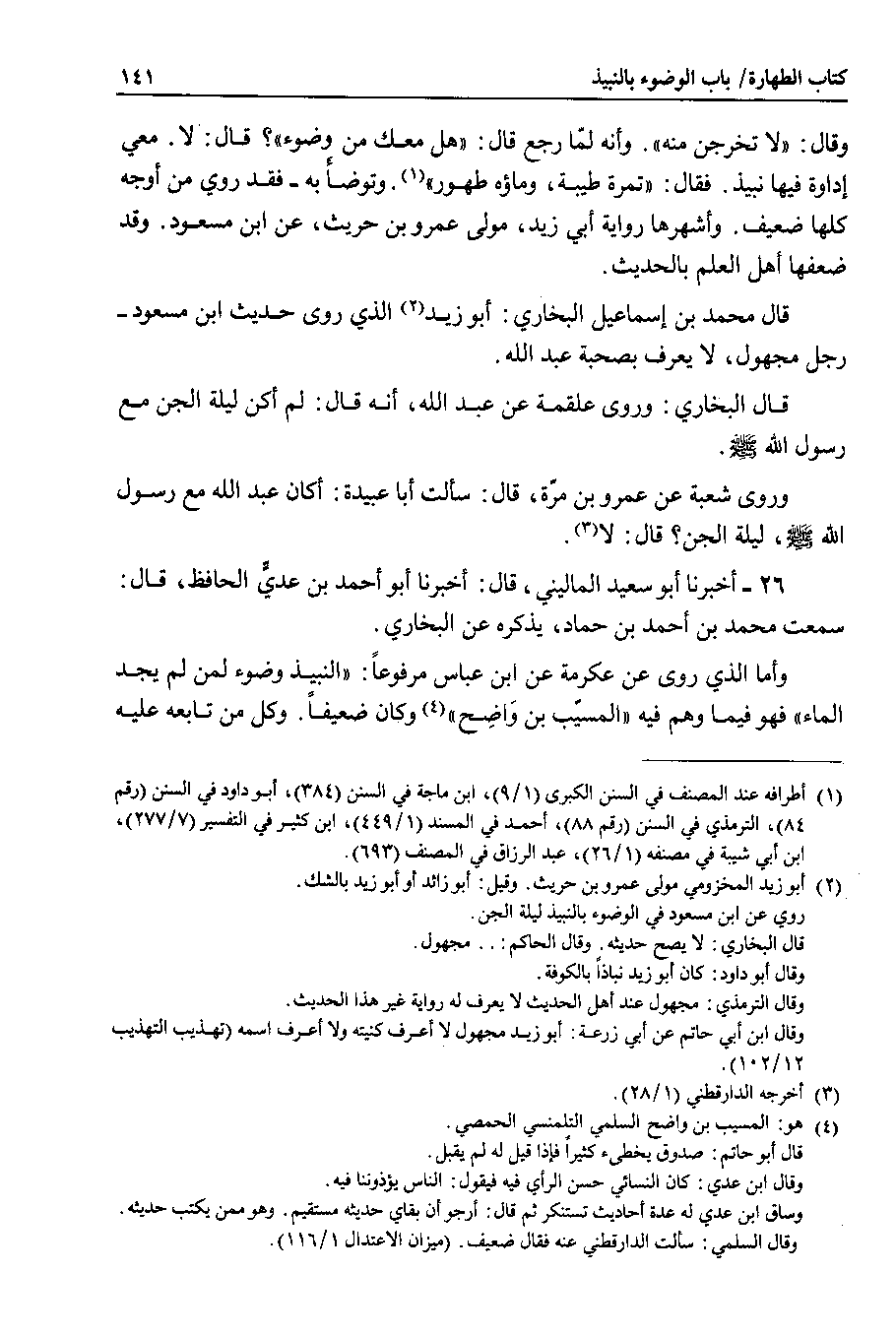 وقال : لا تخرجن منه . وأنه لما رجع قال : هل معك من وضوء ؟ قال : لا . معي إداوة فيها نبيذ . فقال : تمرة طيبة ، وماؤه طهور . وتوضأ به - فقد روي من أوجه كلها ضعيف . وأشهرها رواية أبي زيد ، مولى عمرو بن حريث ، عن ابن مسعود . وقد ضعفها أهل العلم بالحديث.