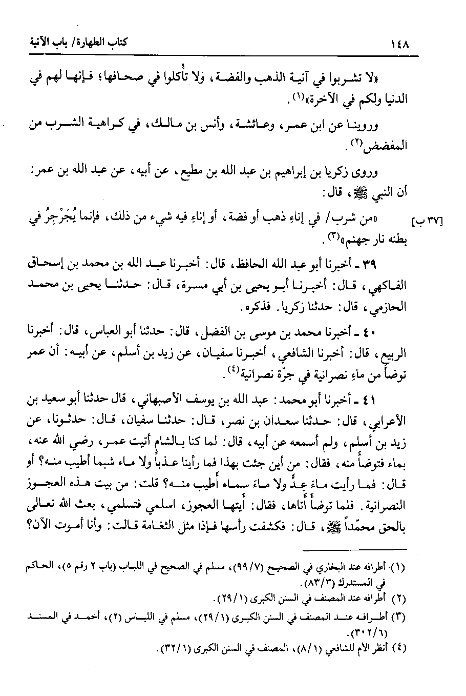 40 - أخبرنا محمد بن موسى بن الفضل ، قال : حدثنا أبو العباس ، قال : أخبرنا الربيع ، قال : أخبرنا الشافعي ، أخبرنا سفيان ، عن زيد بن اسلم ، عن أبيه : أن عمر توضأ من ماء نصرانية في جرة نصرانية.