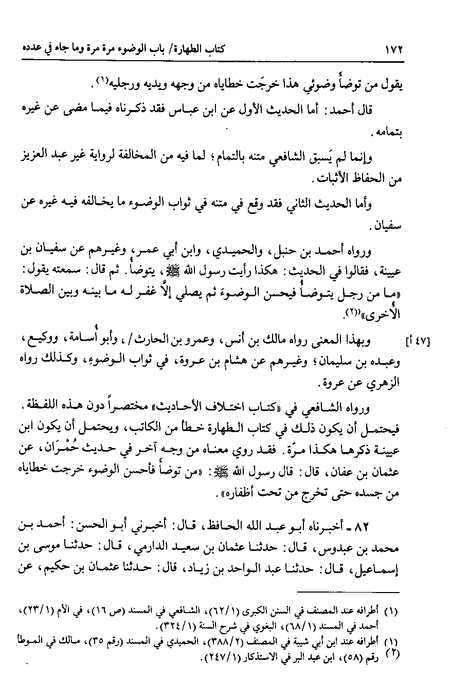 ورواه أحمد بن حنبل ، والحميدي ، وابن أبي عمر ، وغيرهم عن سفيان بن عيينة ، فقالوا في الحديث : هكذا رأيت رسول الله صلى الله عليه وسلم ، يتوضأ . ثم قال : سمعته يقول : ما من رجل يتوضأ فيحسن الوضوء ثم يصلي إلا غفر له ما بينه وبين الصلاة الأخرى.