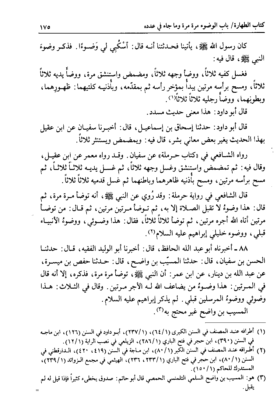 88 - أخبرناه أبو عبد الله الحافظ ، قال : أخبرنا أبو الوليد الفقيه ، قال : حدثنا الحسن بن سفيان ، قال : حدثنا المسيب بن واضح ، قال : حدثنا حفص بن ميسرة ، عن عبد الله بن دينار ، عن ابن عمر : أن النبي صلى الله عليه وسلم ، توضأ مرة مرة ، فذكره ، إلا أنه قال في المرتين : هذا وضوء من يضاعف الله له الاجر مرتين . وقال في الثلاث : هذا وضوئي ووضوء المرسلين قبلي . لم يذكر إبراهيم عليه السلام.