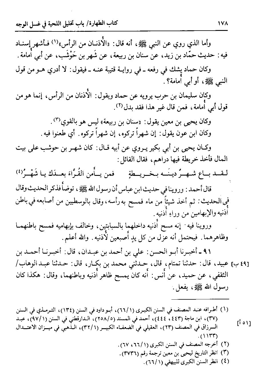 وأما الذي روي عن النبي صلى الله عليه وسلم ، أنه قال : الأذنان من الرأس فأشهر إسناد فيه : حديث حماد بن زيد ، عن سنان بن ربيعة ، عن شهر بن حوشب ، عن أبي أمامة.