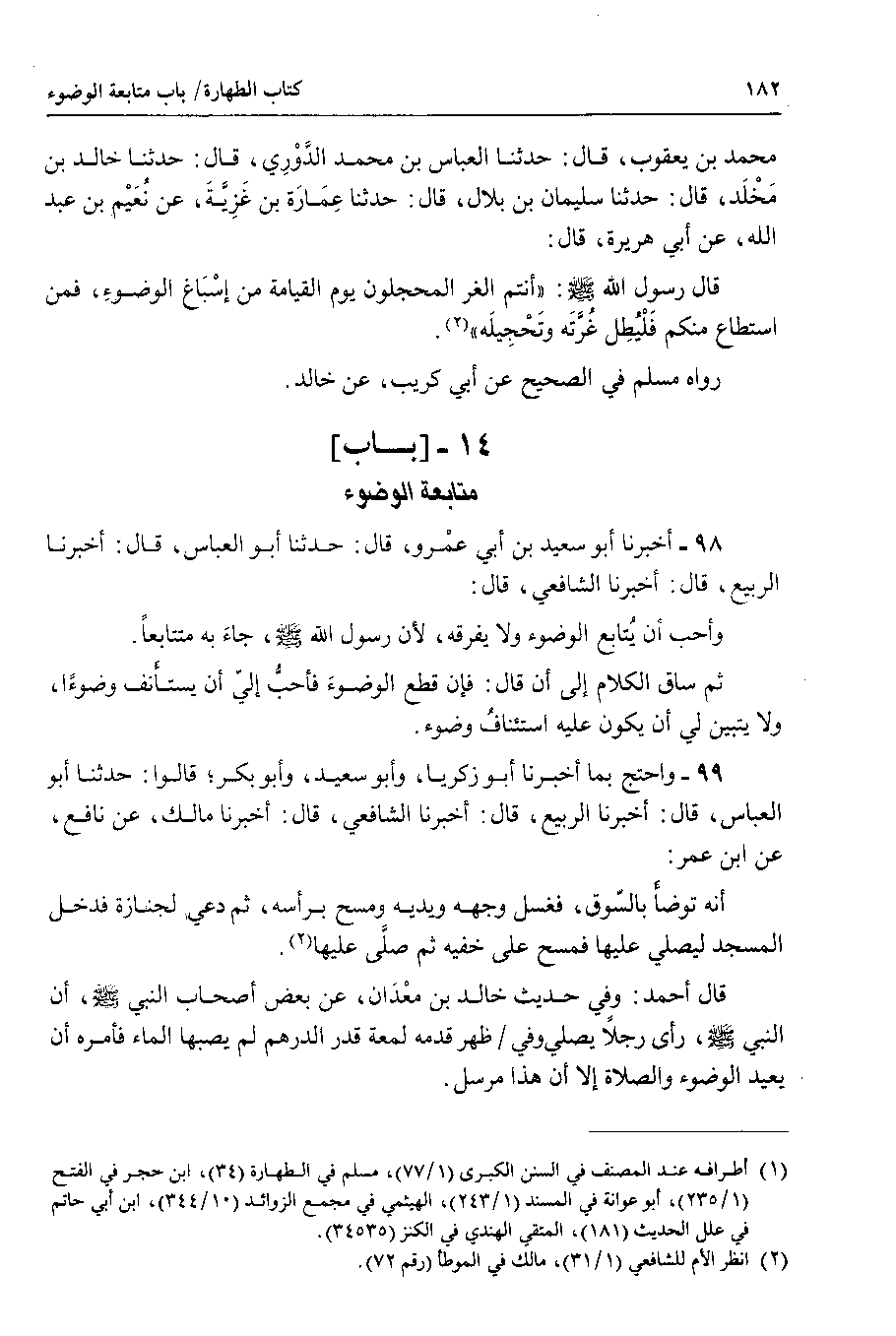 98 - أخبرنا أبو سعيد بن أبي عمرو ، قال : حدثنا أبو العباس ، قال : أخبرنا الربيع ، قال : أخبرنا الشافعي ، قال : وأحب أن يتابع الوضوء ولا يفرقه ، لأن رسول الله صلى الله عليه وسلم ، جاء به متتابعا.