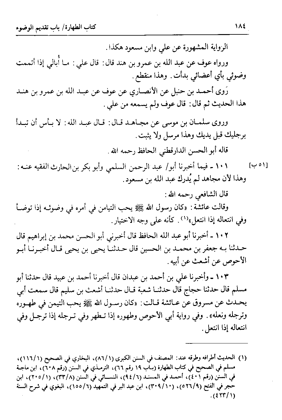 103 - وأخبرنا علي بن أحمد بن عبدان قال أخبرنا أحمد بن عبيد قال حدثنا أبو مسلم قال حدثنا حجاج قال حدثنا شعبة قال حدثنا أشعث بن سليم قال سمعت أبي يحدث عن مسروق عن عائشة قالت : كان رسول الله صلى الله عليه وسلم يحب التيمن في طهوره وترجله ونعله . وفي رواية أبي الأحوص وطهوره إذا تطهر وفي ترجله إذا ترجل وفي انتعاله إذا انتعل.
