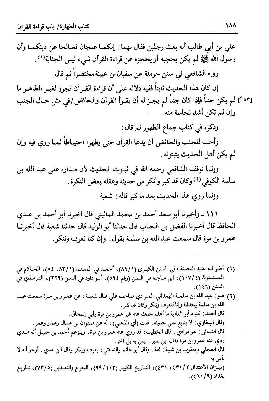 رواه الشافعي في سنن حرملة عن سفيان بن عيينة مختصرا ثم قال : إن كان هذا الحديث ثابتا ففيه دلالة على أن قراءة القرآن تجوز لغير الطاهر ما لم يكن جنبا فإذا كان جنبا لم يجز له أن يقرأ القرآن والحائض في مثل حال الجنب وإن لم تكن أشد نجاسة منه.