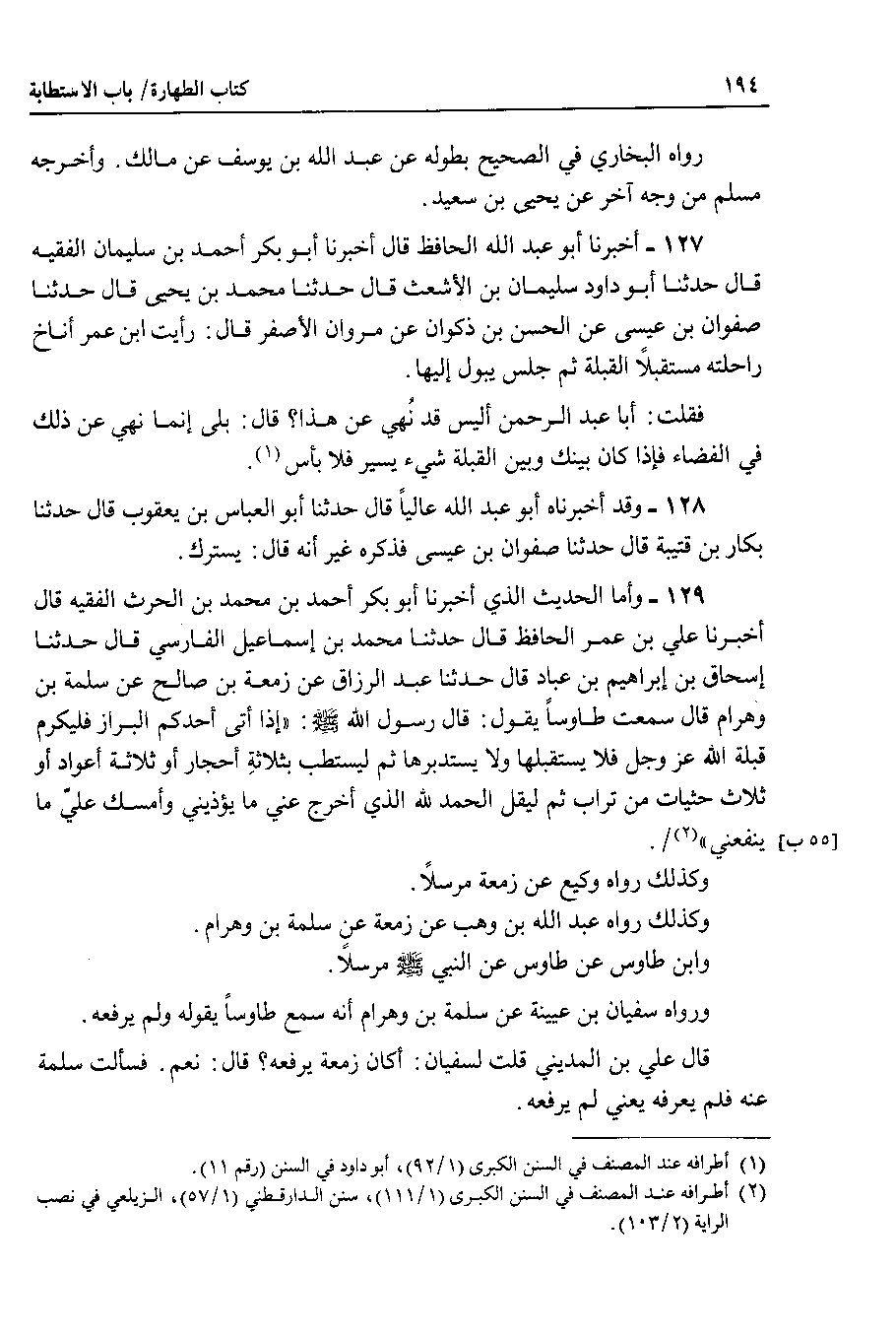 127 - أخبرنا أبو عبد الله الحافظ قال أخبرنا أبو بكر أحمد بن سليمان الفقيه قال حدثنا أبو داود سليمان بن الأشعث قال حدثنا محمد بن يحيى قال حدثنا صفوان بن عيسى عن الحسن بن ذكوان عن مروان الاصفر قال : رأيت ابن عمر أناخ راحلته مسقبلاً القبلة ثم جلس يبول إليها.