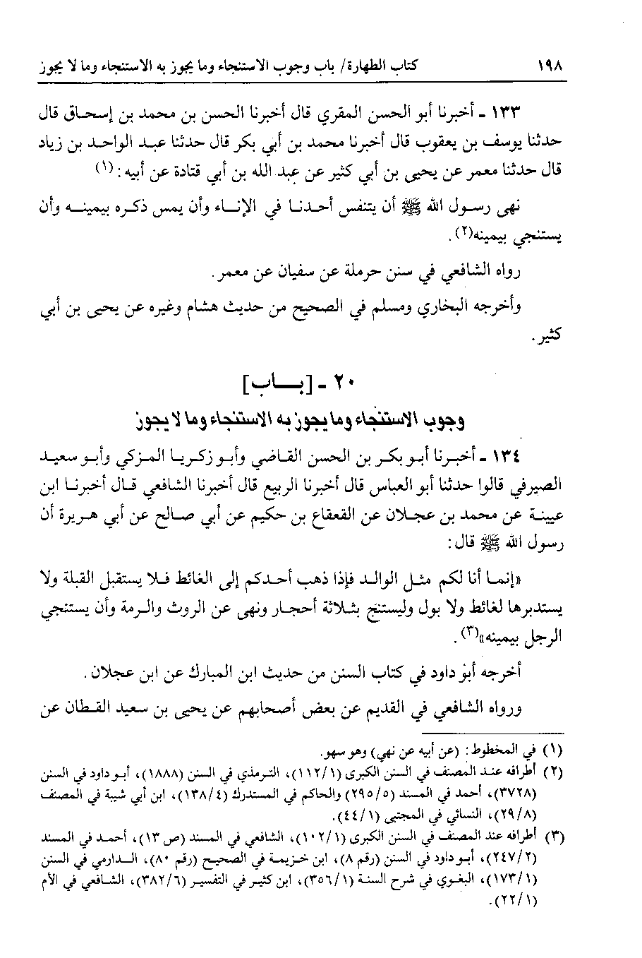 134 - أخبرنا أبو بكر بن الحسن القاضي وأبو زكريا المزكي وأبو سعيد الصيرفي قالوا حدثنا أبو العباس قال أخبرنا الربيع قال أخبرنا الشافعي قال أخبرنا ابن عيينة عن محمد بن عجلان عن القعقاع بن حكيم عن أبي صالح عن أبي هريرة أن رسول الله صلى الله عليه وسلم قال : إنما أنا لكم مثل الوالد فإذا ذهب أحدكم إلى الغائط فلا يستقبل القبلة ولا يستدبرها لغائط ولا بول وليستنج بثلاثة أحجار ونهى عن الروث والرمة وأن يستنجي الرجل بيمينه.