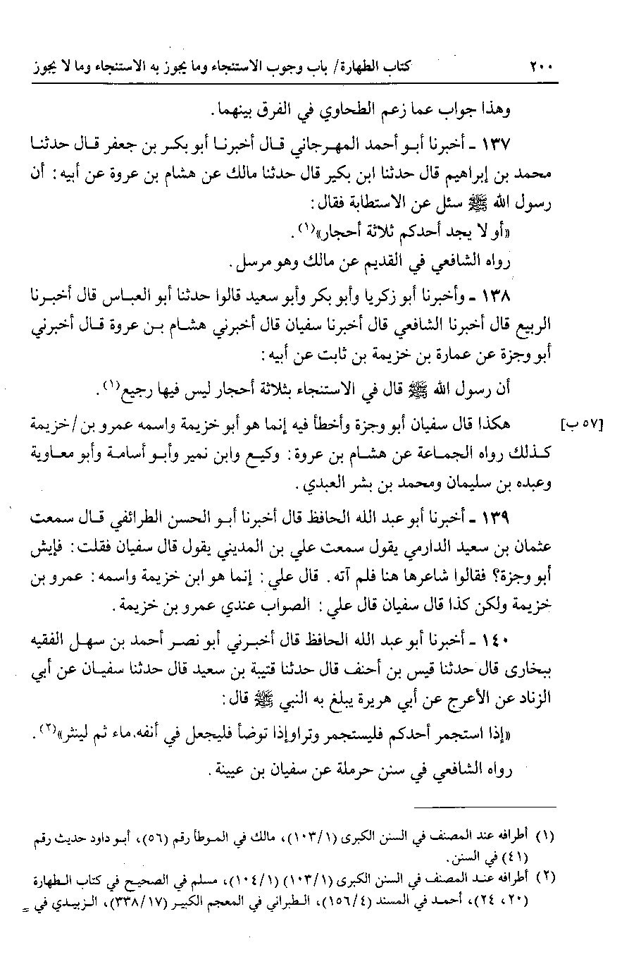 138 - وأخبرنا أبو زكريا وأبو بكر وأبو سعيد قالوا حدثنا أبو العباس قال أخبرنا الربيع قال أخبرنا الشافعي قال أخبرنا سفيان قال أخبرني هشام بن عروة قال أخبرني أبو وجزة عن عمارة بن خزيمة بن ثابت عن أبيه : أن رسول الله صلى الله عليه وسلم قال في الاستنجاء بثلاثة أحجار ليس فيها رجيع.