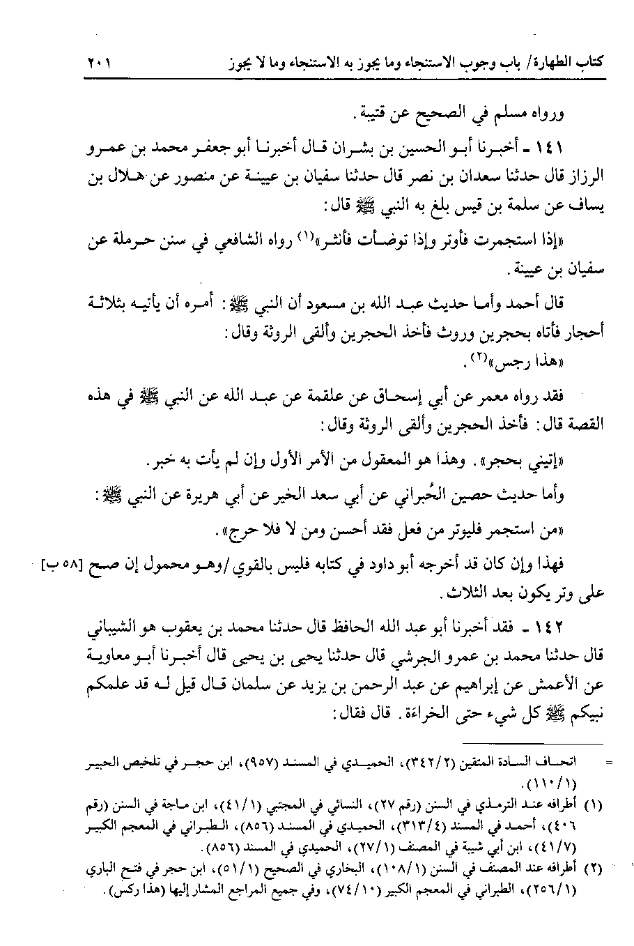 141 - أخبرنا أبو الحسين بن بشران قال أخبرنا أبو جعفر محمد بن عمرو الرزاز قال حدثنا سعدان بن نصر قال حدثنا سفيان بن عيينة عن منصور عن هلال بن يَِسَاف عن سلمة بن قيس بلغ به النبي صلى الله عليه وسلم قال : إذا استجمرت فأوتر وإذا توضأت فأنثر رواه الشافعي في سنن حرملة عن سفيان بن عيينة.