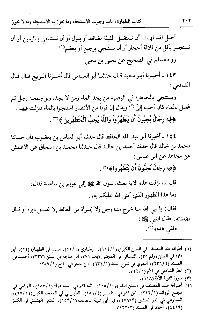 143 - أخبرنا أبو سعيد قال حدثنا أبو العباس قال أخبرنا الربيع قال قال الشافعي ويستنجي بالحجارة في الوضوء من يجد الماء ومن لا يجده ولو جمعه رجل ثم غسل بالماء كان أحب إلي ويقال إن قوما من الأنصار استنجوا بالماء فنزلت فيهم.