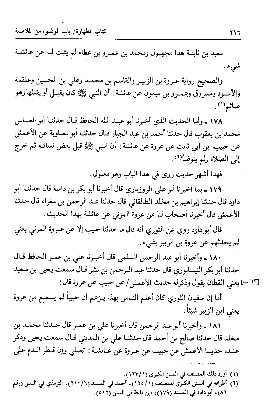 178 - وأما الحديث الذي أخبرنا أبو عبد الله الحافظ قال حدثنا أبو العباس محمد بن يعقوب قال حدثنا أحمد بن عبد الجبار قال حدثنا أبو معاوية عن الأعمش عن حبيب بن أبي ثابت عن عروة عن عائشة : أن النبي صلى الله عليه وسلم قبل بعض نسائه ثم خرج إلى الصلاة ولم يتوضأ.