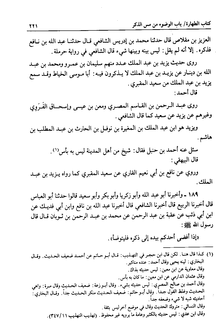 189 - وأخبرنا أبو عبد الله وأبو زكريا وأبو بكر وأبو سعيد قالوا حدثنا أبو العباس قال أخبرنا الربيع قال أخبرنا الشافعي قال أخبرنا عبد الله بن نافع وابن أبي فديك عن ابن أبي ذئب عن عقبة بن عبد الرحمن عن محمد بن عبد الرحمن بن ثوبان قال قال رسول الله صلى الله عليه وسلم : إذا أفضى أحدكم بيده إلى ذكره فليتوضأ.