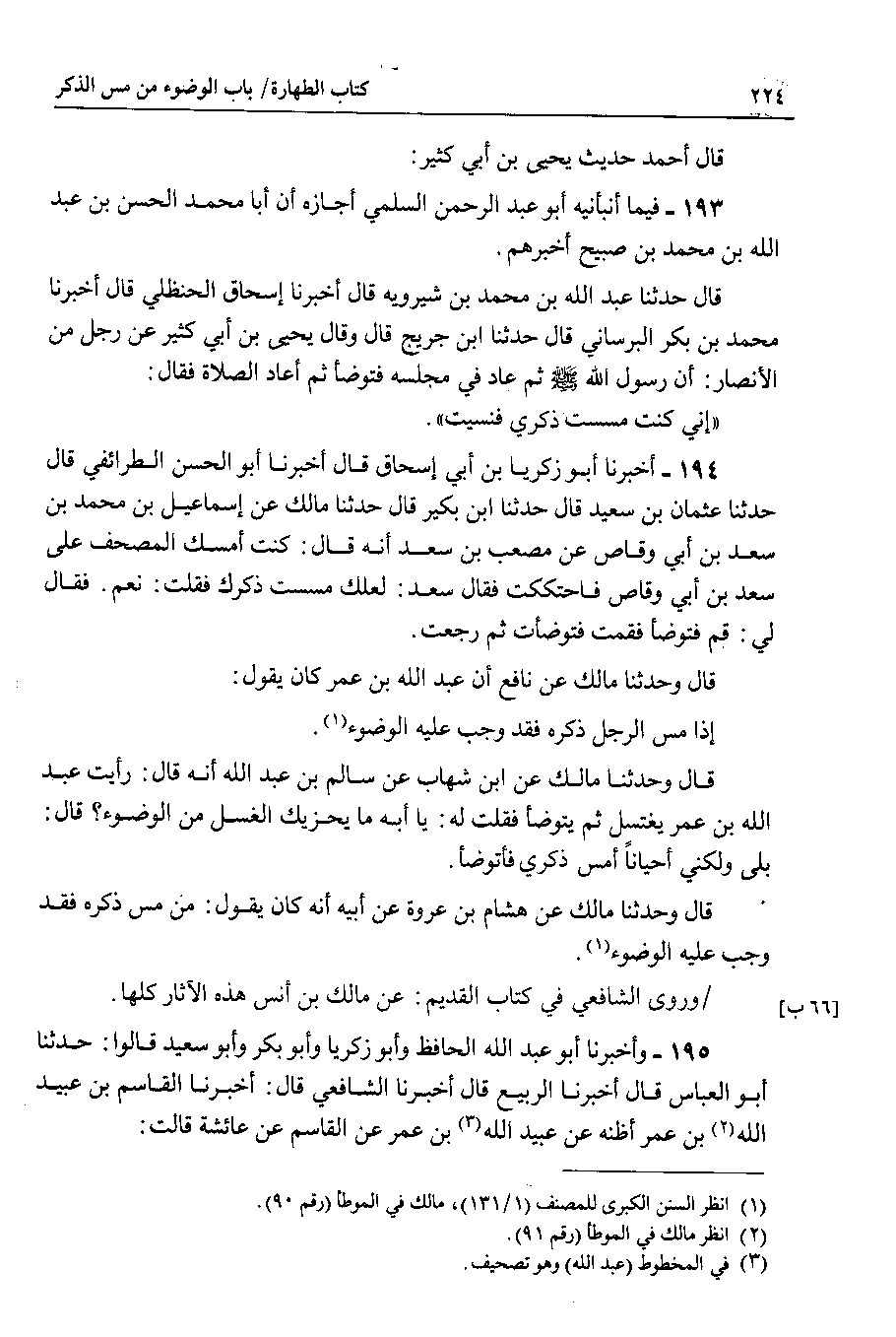 194 - أخبرنا أبو زكريا بن أبي إسحاق قال أخبرنا أبو الحسن الطرائفي قال حدثنا عثمان بن سعيد قال حدثنا ابن بكير قال حدثنا مالك عن إسماعيل بن محمد بن سعد بن أبي وقاص عن مصعب بن سعد أنه قال Y كنت أمسك المصحف على سعد بن أبي وقاص فاحتككت فقال سعد Y لعلك مسست ذكرك فقلت Y نعم . فقال لي Y قم فتوضأ فقمت فتوضأت ثم رجعت.