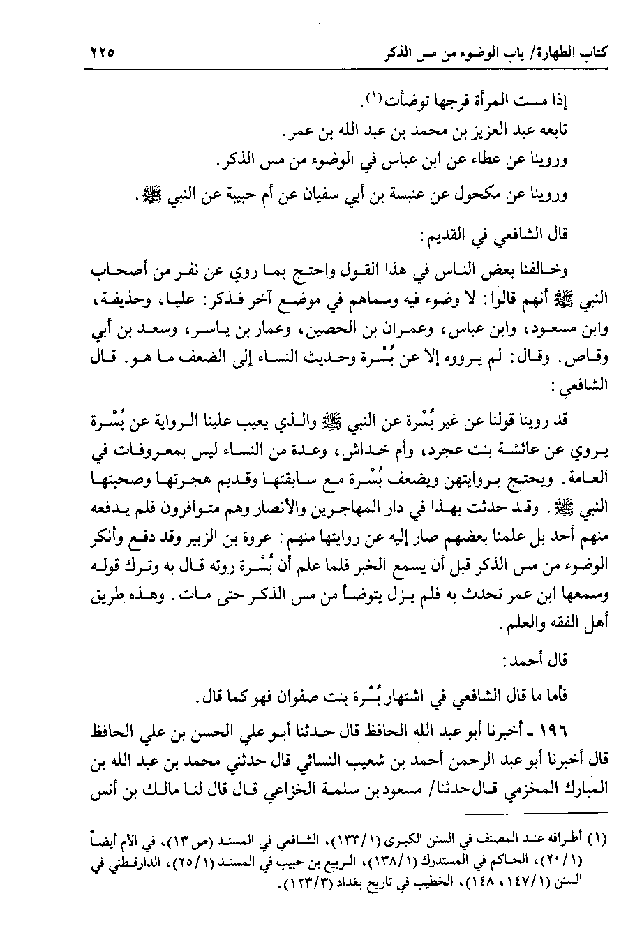 قال الشَّافِعِيُّ : قد روينا قولنا عن غير بسرة عن النبي صلى الله عليه وسلم والذي يعيب علينا الرواية عن بسرة يروي عن عائشة بنت عجرد ، وأم خداش ، وعدة من النساء ليس بمعروفات في العامة . ويحتج بروايتهن ويضعف بسرة مع سابقتها وقديم هجرتها وصحبتها النبي صلى الله عليه وسلم . وقد حدثت بهذا في دار المهاجرين والأنصار وهم متوافرون فلم يدفعه منهم أحد بل علمنا بعضهم صار إليه عن روايتها منهم : عروة بن الزبير وقد دفع وأنكر الوضوء من مس الذكر قبل أن يسمع الخبر فلما علم أن بسرة روته قال به وترك قوله وسمعها ابن عمر تحدث به فلم يزل يتوضأ من مس الذكر حتى مات . وهذه طريق أهل الفقه والعلم.