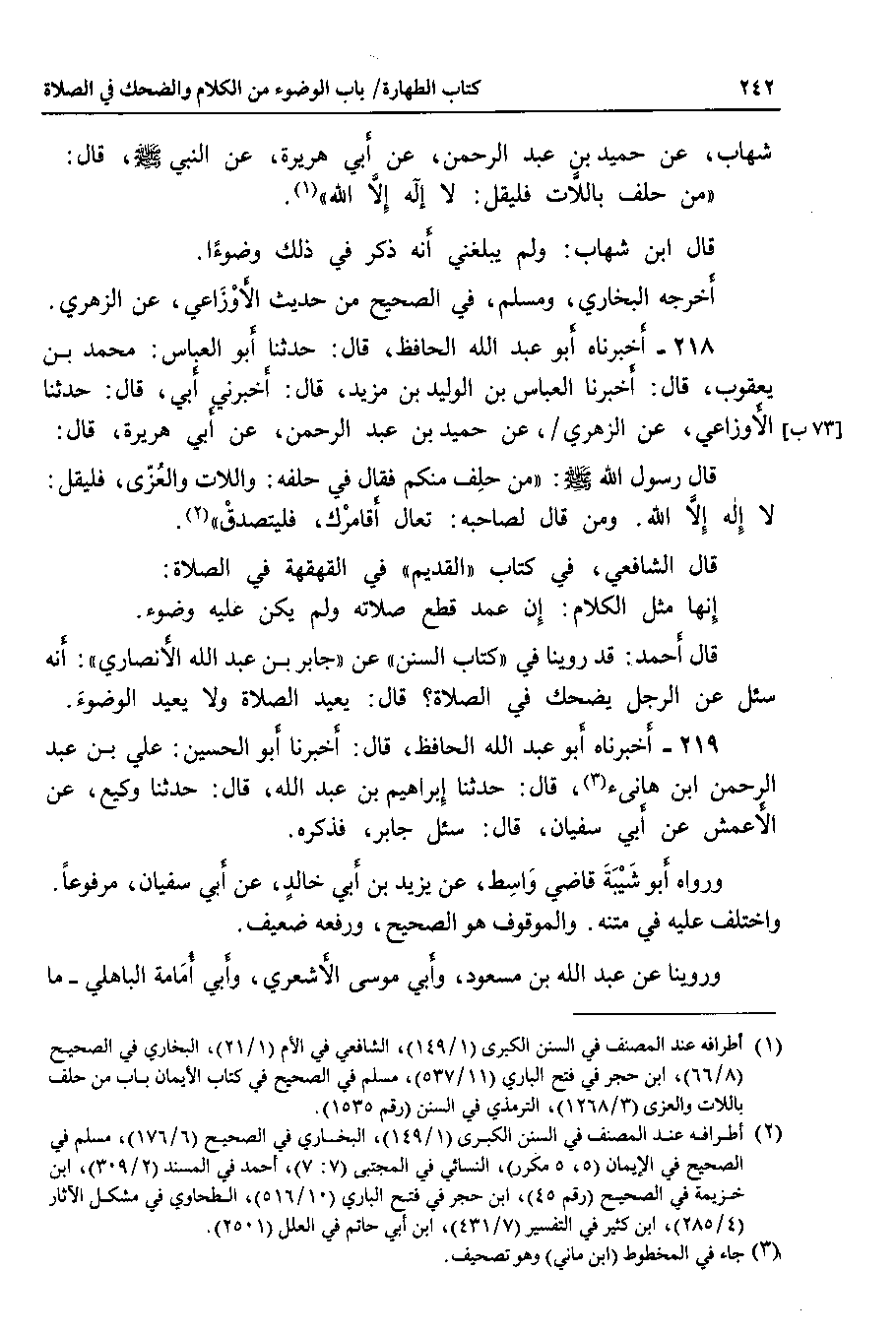 218 - أخبرناه أبو عبد الله الحافظ ، قال : حدثنا أبو العباس : محمد بن يعقوب ، قال : أخبرنا العباس بن الوليد بن مزيد ، قال : أخبرني أبي ، قال : حدثنا الأوزاعي ، عن الزهري ، عن حميد بن عبد الرحمن ، عن أبي هريرة ، قال : قال رسول الله صلى الله عليه وسلم : من حلف منكم فقال في حلفه : واللات والعزى ، فليقل : لا إله إلا الله . ومن قال لصاحبه : تعال أقامرك ، فليتصدق.