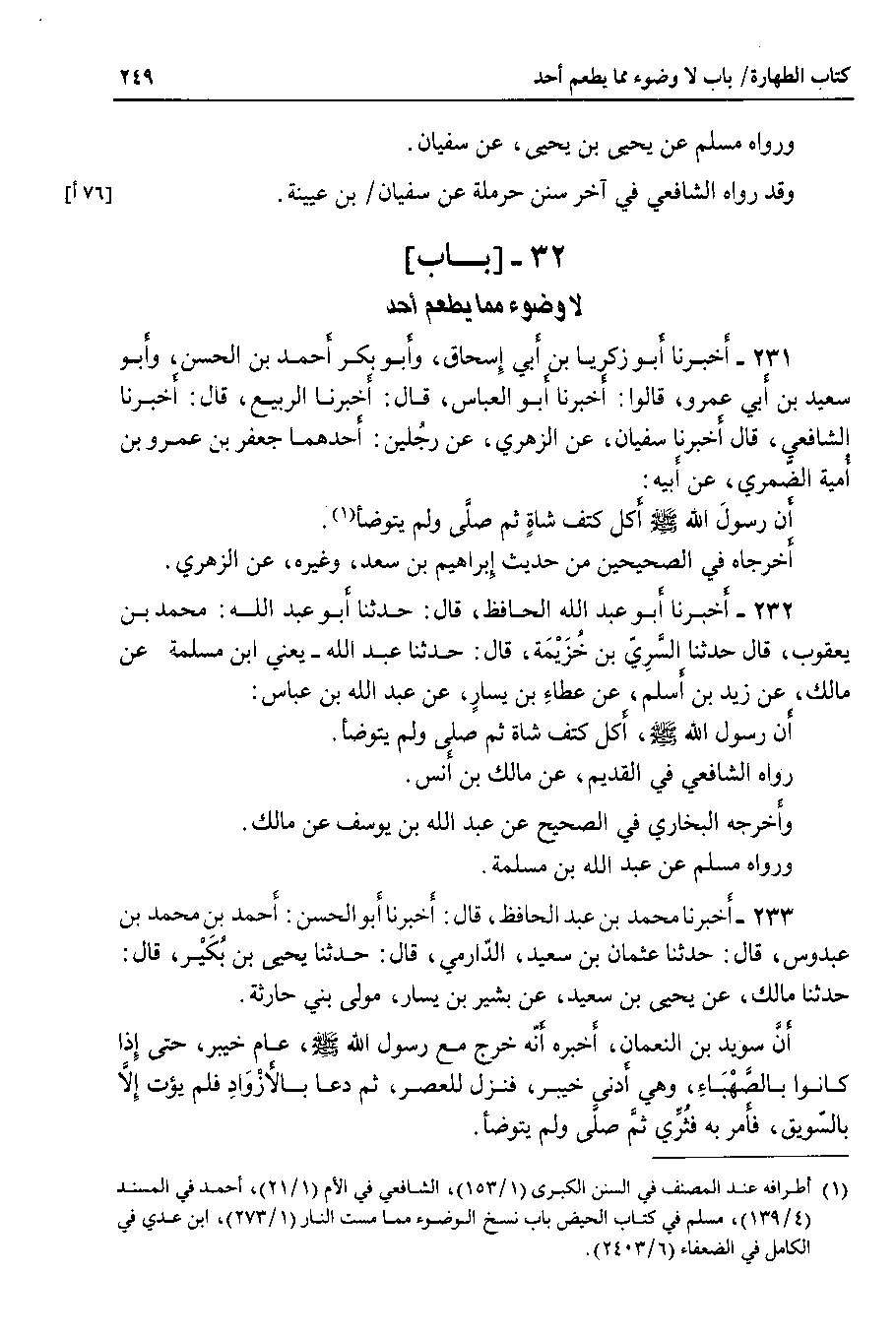 231 - أخبرنا أبو زكريا بن أبي إسحاق ، وأبو بكر أحمد بن الحسن ، وأبو سعيد بن أبي عمرو ، قالوا : أخبرنا أبو العباس ، قال : أخبرنا الربيع ، قال : أخبرنا الشافعي ، قال أخبرنا سفيان ، عن الزهري ، عن رجلين : أحدهما جعفر بن عمرو بن أمية الضمري ، عن أبيه : أن رسول الله صلى الله عليه وسلم أكل كتف شاة ثم صلى ولم يتوضأ.