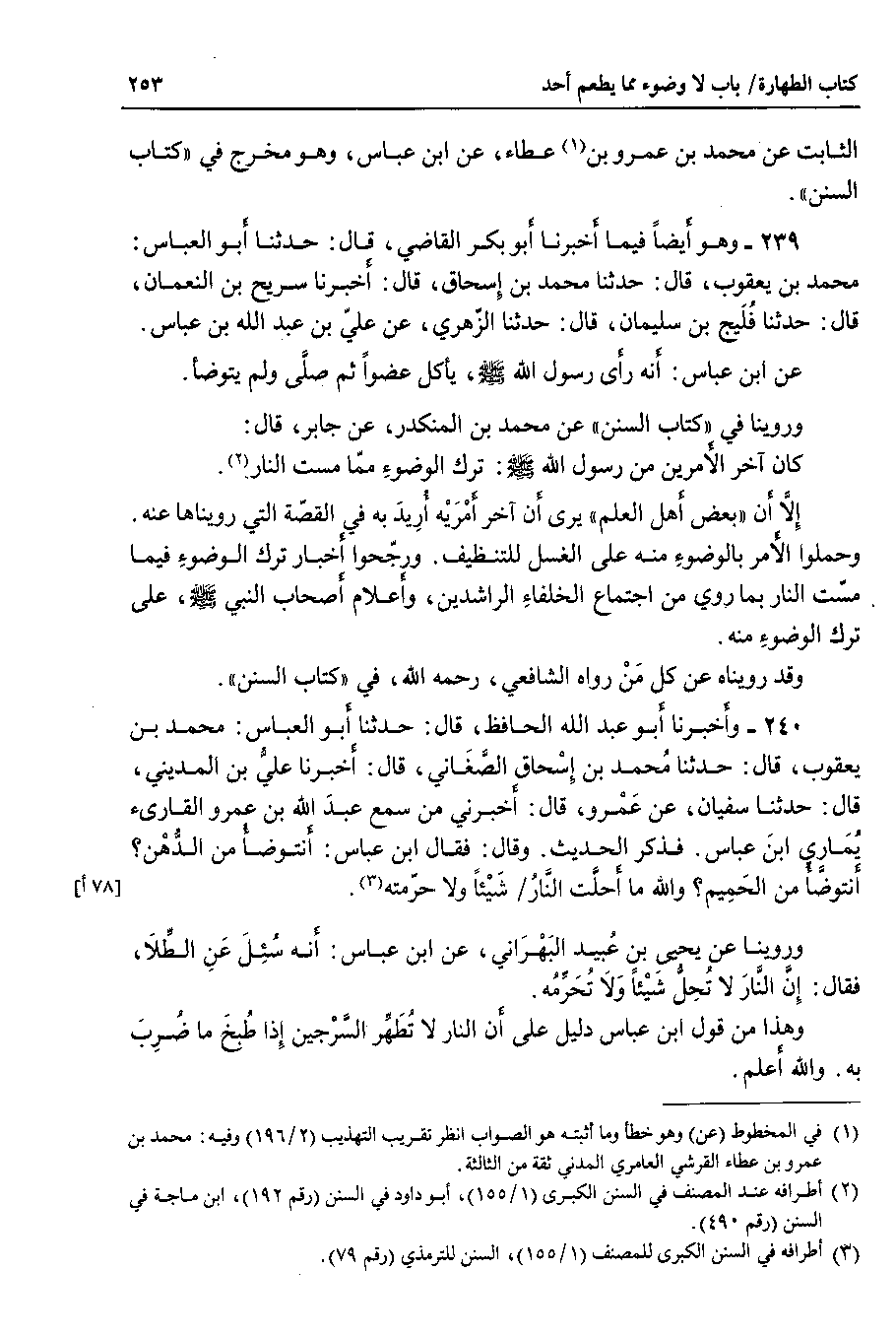 240 - وأخبرنا أبو عبد الله الحافظ ، قال : حدثنا أبو العباس : محمد بن يعقوب ، قال حدثنا محمد بن إسحاق الصغاني ، قال : أخبرنا علي بن المديني ، قال : حدثنا سفيان ، عن عمرو ، قال : أخبرني من سمع عبد الله بن عمرو القارئ يماري ابن عباس . فذكر الحديث . وقال : فقال ابن عباس : أنتوضأ من الدهن ؟ أنتوضأ من الحميم ؟ والله ما أحلت النار شيئا ولا حرمته.