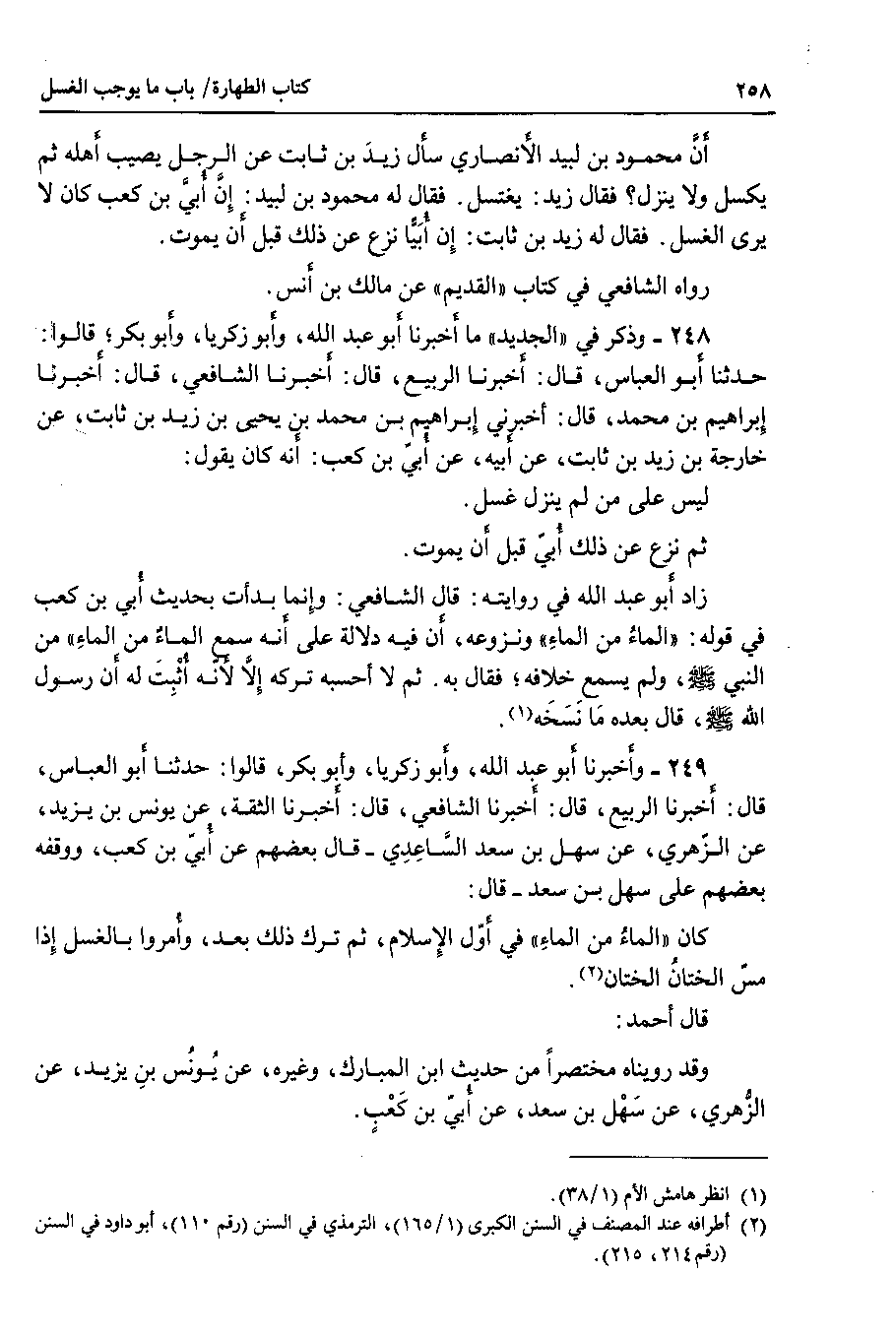 249 - وأخبرنا أبو عبد الله ، وأبو زكريا ، وأبو بكر ، قالوا : حدثنا أبو العباس ، قال : أخبرنا الربيع ، قال : أخبرنا الشافعي ، قال : أخبرنا الثقة ، عن يونس بن يزيد ، عن الزهري ، عن سهل بن سعد الساعدي - قال بعضهم عن أبي بن كعب ، ووقفه بعضهم على سهل بن سعد - قال : كان الماء من الماء في أول الإسلام ، ثم ترك ذلك بعد ، وأمروا بالغسل إذا مس الختان الختان.