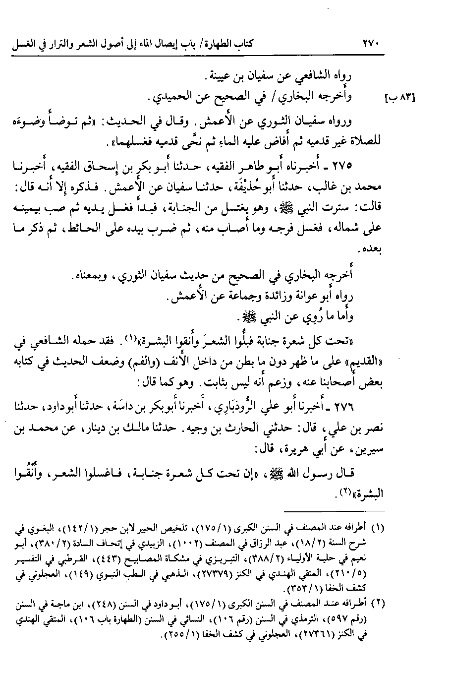 تحت كل شعرة جنابة فبلوا الشعر وأنقوا البشرة . فقد حمله الشافعي في القديم على ما ظهر دون ما بطن من داخل الأنف ( والفم ) وضعف الحديث في كتابه بعض أصحابنا عنه ، وزعم أنه ليس بثابت . وهو كما قال 276 - أخبرنا أبو علي الروذباري ، أخبرنا أبو بكر بن داسة ، حدثنا أبو داود ، حدثنا نصر بن علي ، قال : حدثني الحارث بن وجيه . حدثنا مالك بن دينار ، عن محمد بن سيرين ، عن أبي هريرة ، قال : قال رسول الله صلى الله عليه وسلم ، إن تحت كل شعرة جنابة ، فاغسلوا الشعر ، وأنقوا البشرة.