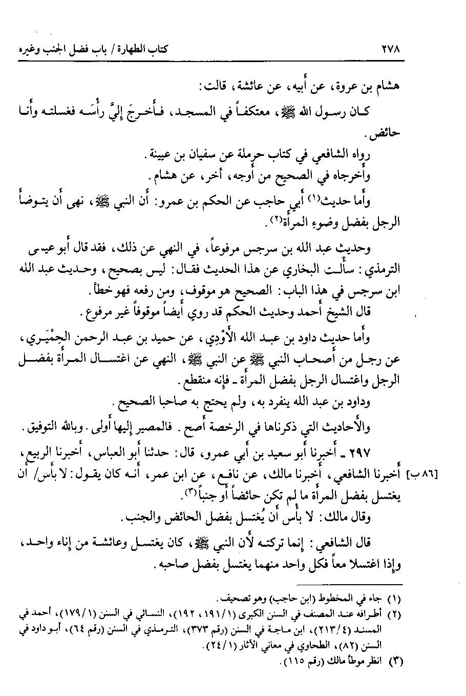أَخْبَرَنَا الشافعي ، أخبرنا مالك ، عن نافع ، عن ابن عمر ، أنه كان يقول : لا بأس أن يغتسل بفضل المرأة ما لم تكن حائضا أو جنبا.