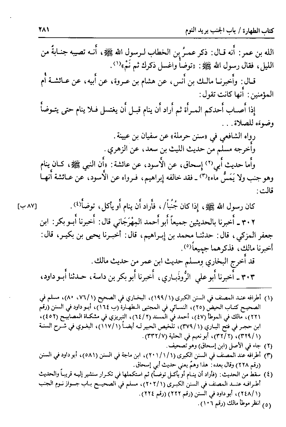 الله بن عمر : أنه قال : ذكر عمر بن الخطاب لرسول الله صلى الله عليه وسلم ، أنه تصيبه جنابة من الليل ، فقال رسول الله صلى الله عليه وسلم : توضأ واغسل ذكرك ثم نم.