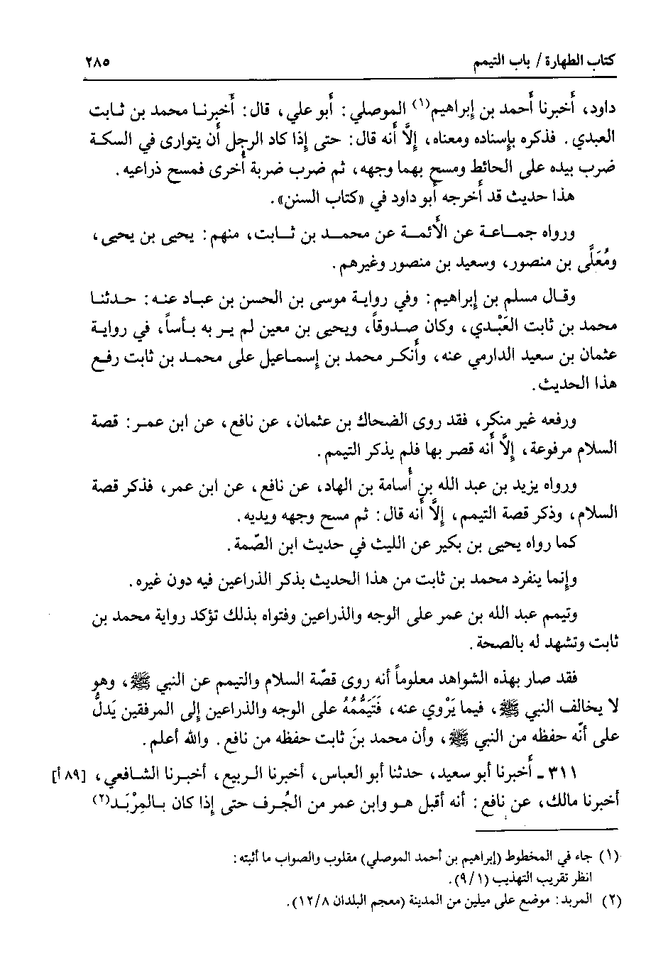 داود ، أخبرنا أحمد بن إبراهيم الموصلي : أبو علي ، قال : أخبرنا محمد بن ثابت العبدي . فذكره بإسناده ومعناه ، إلا أنه قال : حتى إذا كاد الرجل أن يتوارى في السكة ضرب بيده على الحائط ومسح بهما وجهه ، ثم ضرب ضربة أخرى فمسح ذراعيه.