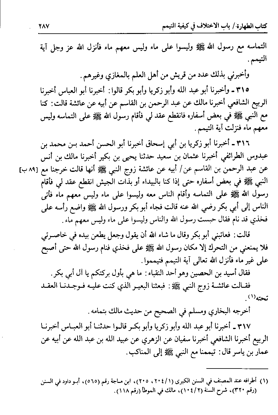 315 - وأخبرنا أبو عبد الله وأبو زكريا وأبو بكر قالوا : أخبرنا أبو العباس أخبرنا الربيع الشافعي أخبرنا مالك عن عبد الرحمن بن القاسم عن أبيه عن عائشة قالت : كنا مع النبي صلى الله عليه وسلم في بعض أسفاره فانقطع عقد لي فأقام رسول الله صلى الله عليه وسلم على التماسه وليس معهم ماء فنزلت آية التيمم.