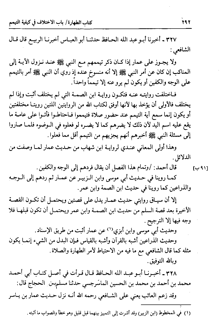 327 - أخبرنا أبو عبد الله الحافظ حدثنا أبو العباس أخبرنا الربيع قال قال الشافعي : ولا يجوز على عمار إذا كان ذكر تيممهم مع النبي صلى الله عليه وسلم عند نزول الآية إلى المناكب إن كان عن أمر النبي صلى الله عليه وسلم إلا أنه منسوخ عنده إذ روي أن النبي صلى الله عليه وسلم أمر بالتيمم على الوجه والكفين أو يكون لم يرو عنه إلا تيمما واحدا.