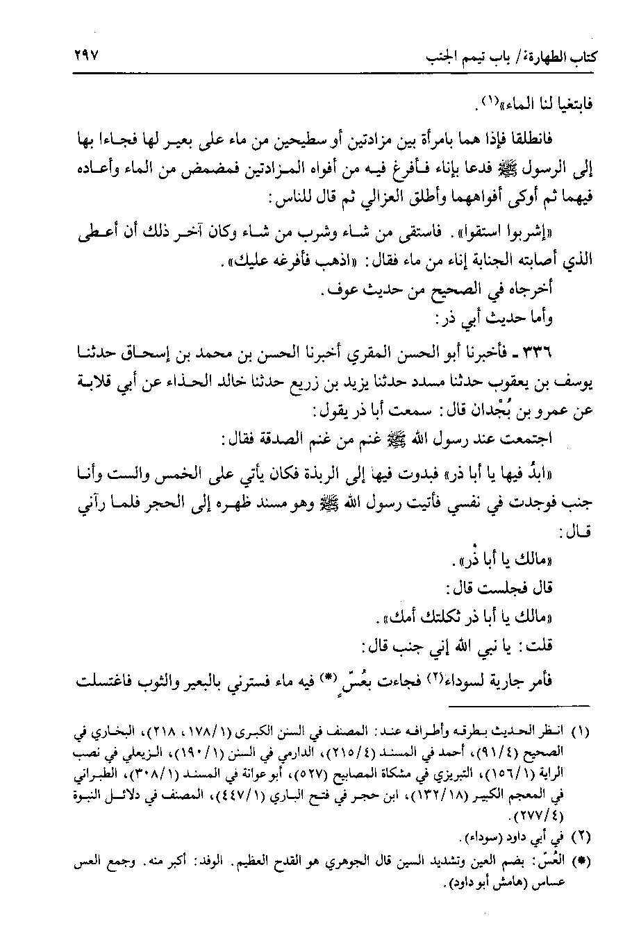 وأما حديث أبي ذر 336 - فأخبرنا أبو الحسن المقري أخبرنا الحسن بن محمد بن إسحاق حدثنا يوسف بن يعقوب حدثنا مسدد حدثنا يزيد بن زريع حدثنا خالد الحذاء عن أبي قلابة عن عمرو بن بجدان قال : سمعت أبا ذر يقول : اجتمعت عند رسول الله صلى الله عليه وسلم غنم من غنم الصدقة فقال : ابد فيها يا أبا ذر فبدوت فيها إلى الربذة فكان يأتي على الخمس والست وأنا جنب فوجدت في نفسي فأتيت رسول الله صلى الله عليه وسلم وهو مسند ظهره إلى الحجر فلما رآني قال : مالك يا أبا ذر.