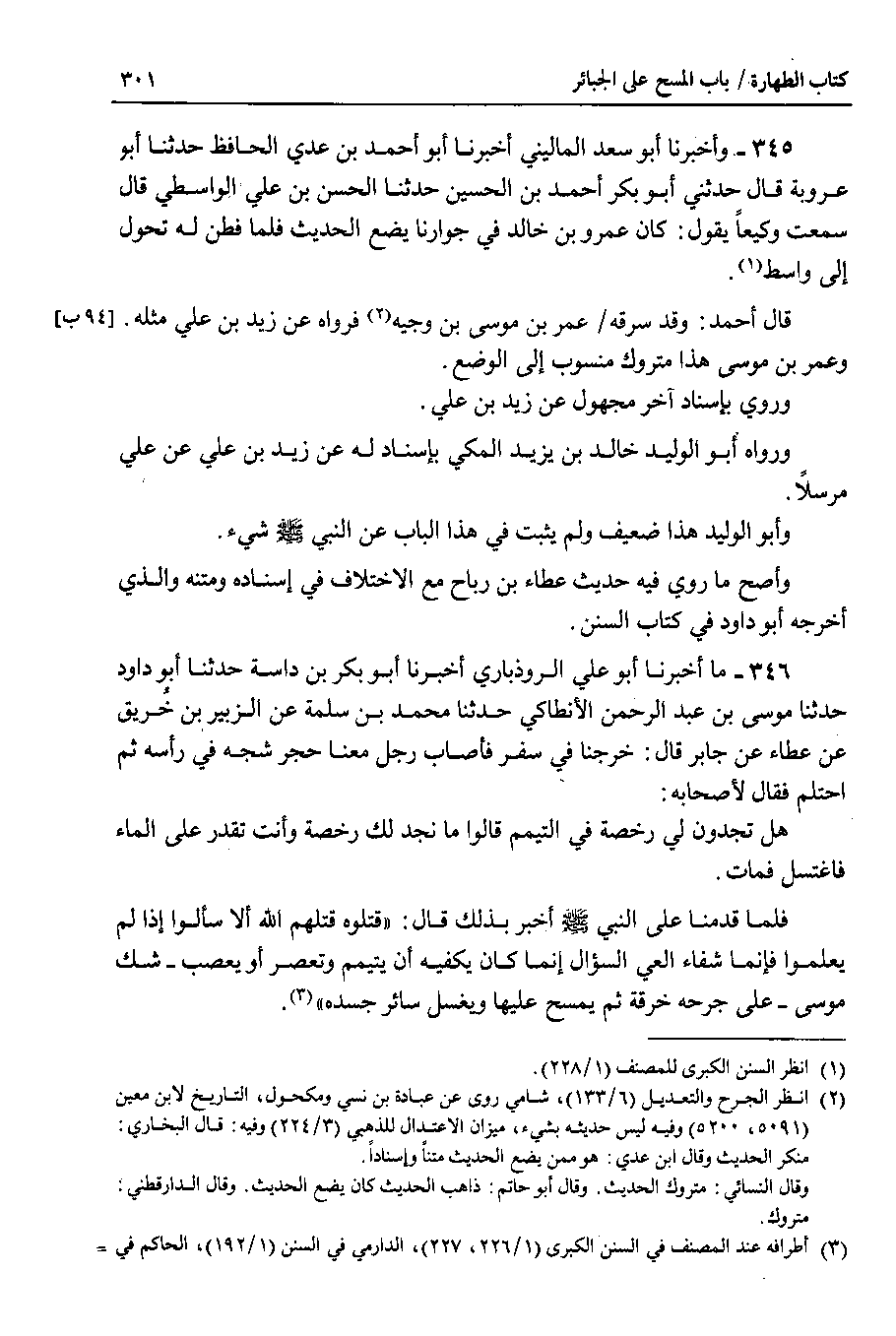 346 - ما أخبرنا أبو علي الروذباري أخبرنا أبو بكر بن داسة حدثنا أبو داود حدثنا موسى بن عبد الرحمن الأنطاكي حدثنا محمد بن سلمة عن الزبير بن خريق عن عطاء عن جابر قال : خرجنا في سفر فأصاب رجل معنا حجر شجه في رأسه ثم احتلم فقال لأصحابه : هل تجدون لي رخصة في التيمم قالوا ما نجد لك رخصة وأنت تقدر على الماء فاغتسل فمات.