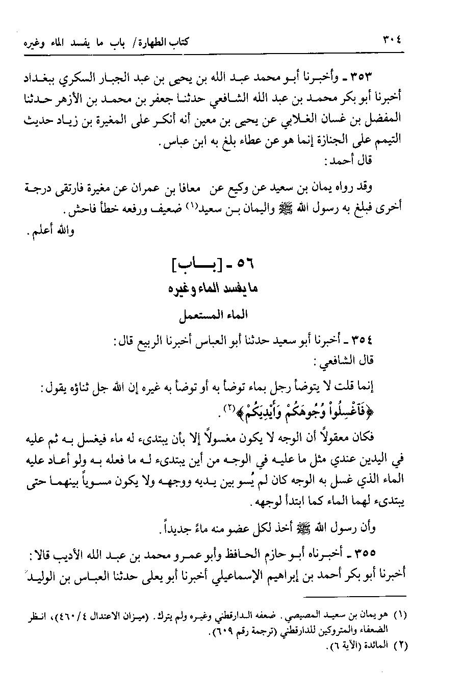 354 - أخبرنا أبو سعيد حدثنا أبو العباس أخبرنا الربيع قال : قال الشافعي : إنما قلت لا يتوضأ رجل بماء توضأ به أو توضأ به غيره إن الله جل ثناؤه يقول : {فاغسلوا وجوهكم وأيديكم}.
