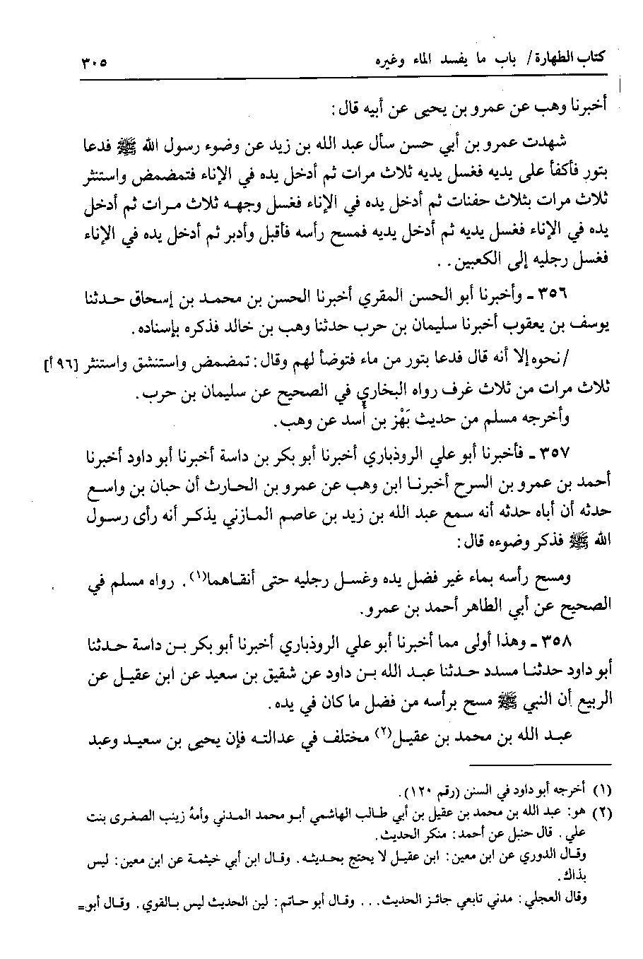 357 - فأخبرنا أبو علي الروذباري أخبرنا أبو بكر بن داسة أخبرنا أبو داود أخبرنا أحمد بن عمرو بن السرح أخبرنا ابن وهب عن عمرو بن الحارث أن حبان بن واسع حدثه أن أباه حدثه أنه سمع عبد الله بن زيد بن عاصم المازني يذكر أنه رأى رسول الله صلى الله عليه وسلم فذكر وضوءه قال : ومسح رأسه بماء غير فضل يده وغسل رجليه حتى أنقاهما . رواه مسلم في الصحيح عن أبي الطاهر أحمد بن عمرو.