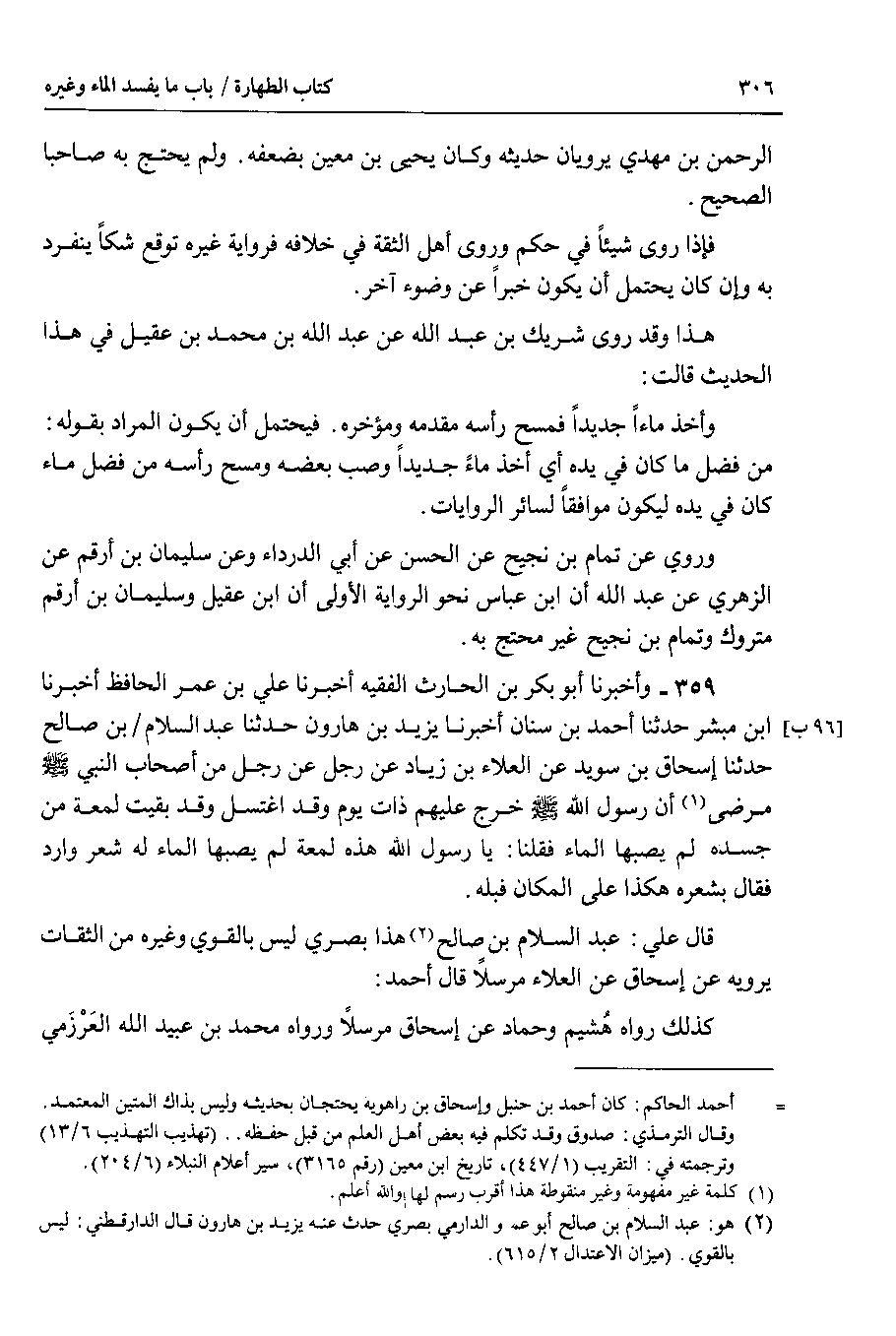 359 - وأخبرنا أبو بكر بن الحارث الفقيه أخبرنا علي بن عمر الحافظ أخبرنا ابن مبشر حدثنا أحمد بن سنان أخبرنا يزيد بن هارون حدثنا عبد السلام بن صالح حدثنا إسحاق بن سويد عن العلاء بن زياد عن رجل عن رجل من أصحاب النبي صلى الله عليه وسلم مرضى أن رسول الله صلى الله عليه وسلم خرج عليهم ذات يوم وقد اغتسل وقد بقيت لمعة من جسده لم يصبها الماء فقلنا : يا رسول الله هذه لمعة لم يصبها الماء له شعر وارد فقال بشعره هكذا على المكان فبله.