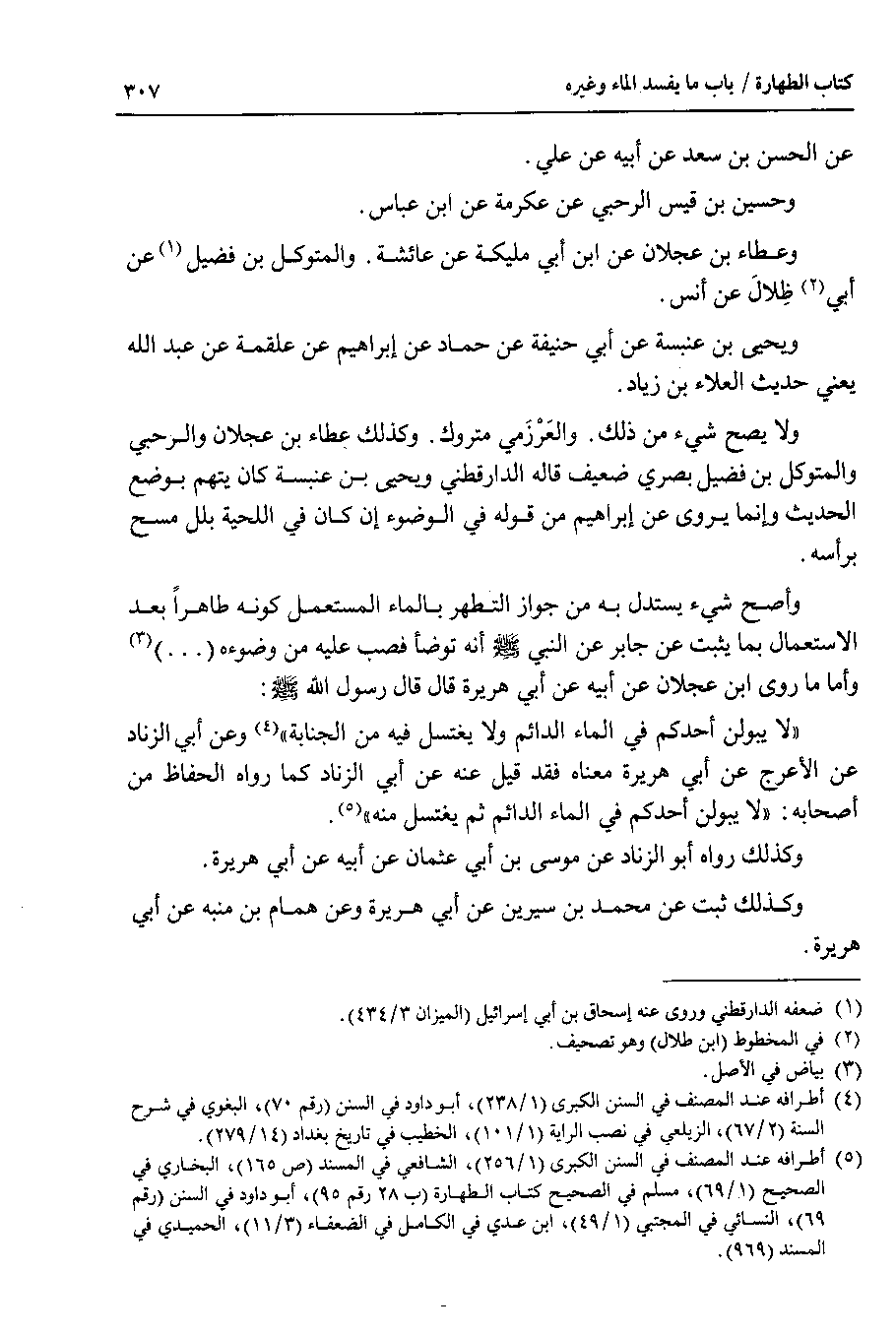 وأصح شيء يستدل به من جواز التطهر بالماء المستعمل كونه طاهرا بعد الاستعمال بما يثبت عن جابر عن النبي صلى الله عليه وسلم أنه توضأ فصب عليه من وضوءه ( . . . ) وأما ما روى ابن عجلان عن أبيه عن أبي هريرة قال قال رسول الله صلى الله عليه وسلم : لا يبولن أحدكم في الماء الدائم ولا يغتسل فيه من الجنابة وعن أبي الزناد عن الأعرج عن أبي هريرة معناه فقد قيل عنه عن أبي الزناد كما رواه الحفاظ من أصحابه : لا يبولن أحدكم في الماء الدائم ثم يغتسل منه.
