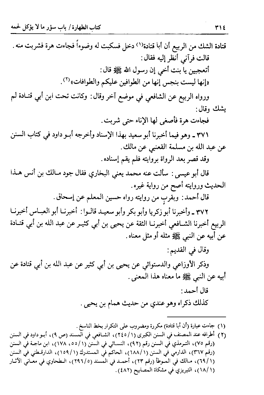 قالت فرآني أنظر إليه فقال : أتعجبين يا بنت أخي إن رسول الله صلى الله عليه وسلم قال : إنها ليست بنجس انها من الطوافين عليكم والطوافات.