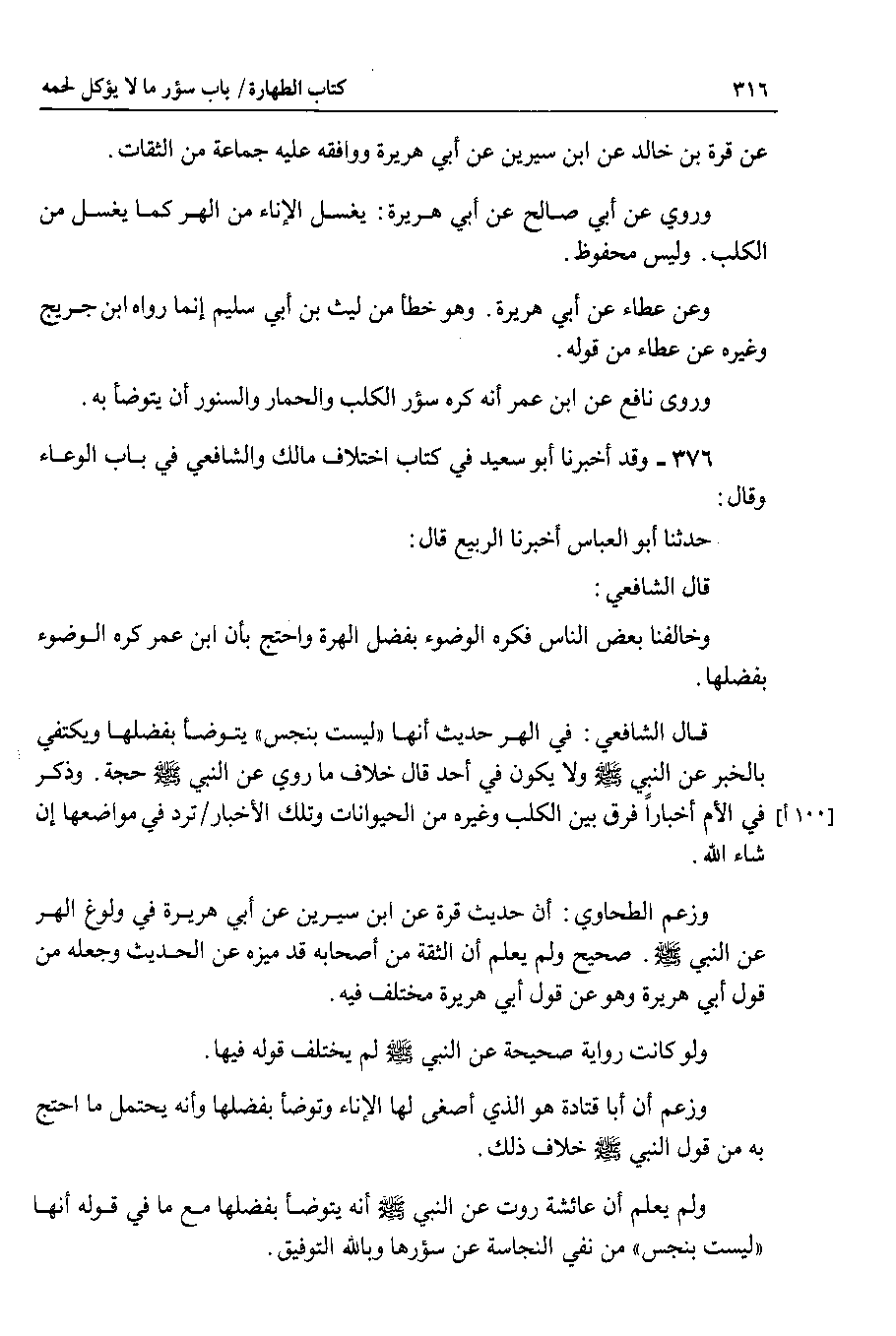 376 - وقد أخبرنا أبو سعيد في كتاب اختلاف مالك والشافعي في باب الوعاء وقال : حدثنا أبو العباس أخبرنا الربيع قال : قال الشافعي : وخالفنا بعض الناس فكره الوضوء بفضل الهرة واحتج بأن ابن عمر كره الوضوء بفضلها.