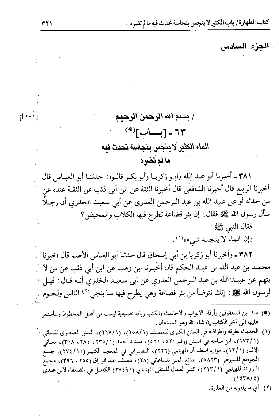 الجزء السادس بسم الله الرحمن الرحيم 63 - باب الماء الكثير لا ينجس بنجاسة تحدث فيه ما لم تضره