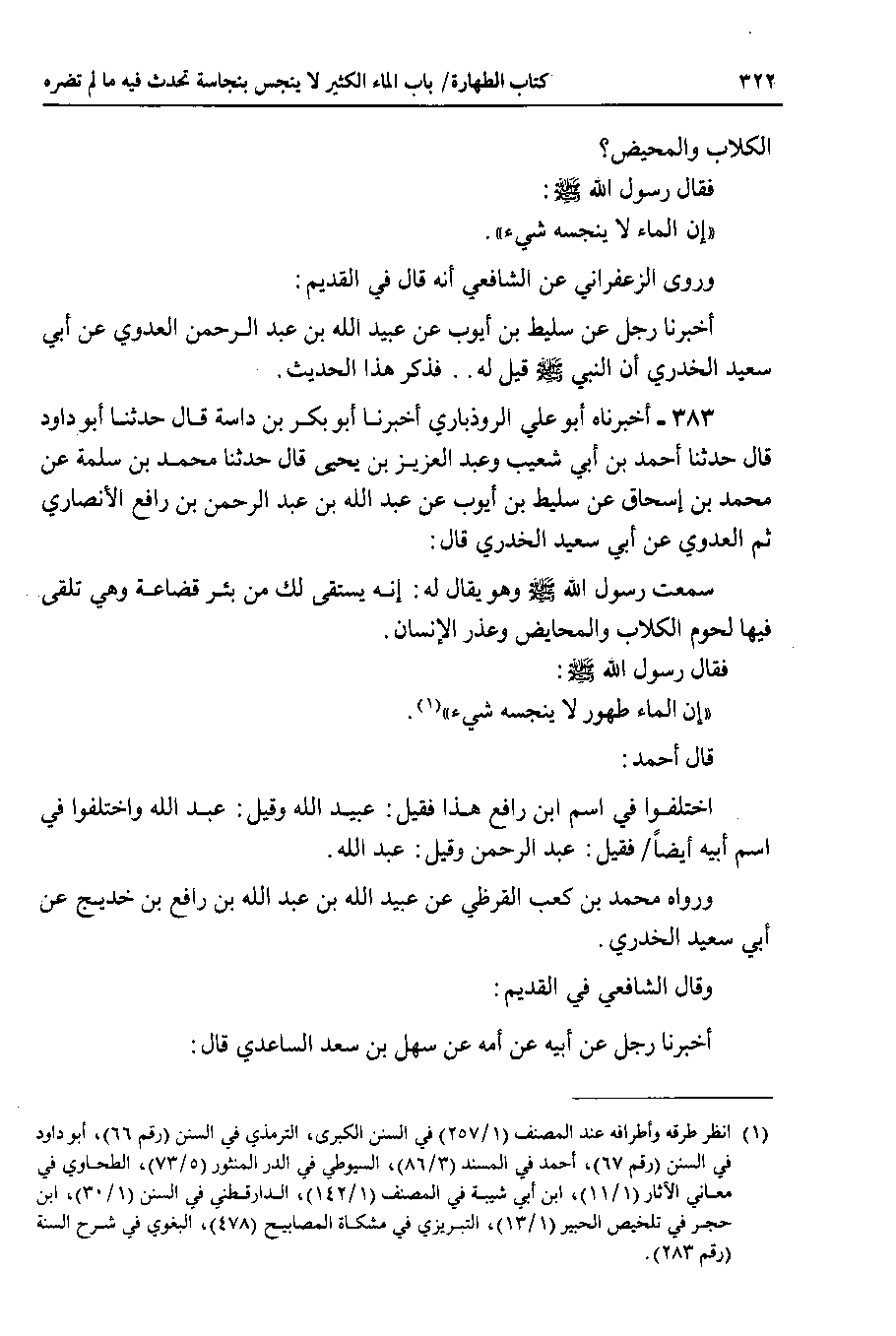 383 - أخبرناه أبو علي الروذباري أخبرنا أبو بكر بن داسة قال حدثنا أبو داود قال حدثنا أحمد بن أبي شعيب وعبد العزيز بن يحيى قال حدثنا محمد بن سلمة عن محمد بن إسحاق عن سليط بن أيوب عن عبد الله بن عبد الرحمن بن رافع الأنصاري ثم العدوي عن أبي سعيد الخدري قال : سمعت رسول الله صلى الله عليه وسلم وهو يقال له : إنه يستقى لك من بئر قضاعة وهي تلقى فيها لحوم الكلاب والمحايض وعذر الإنسان.