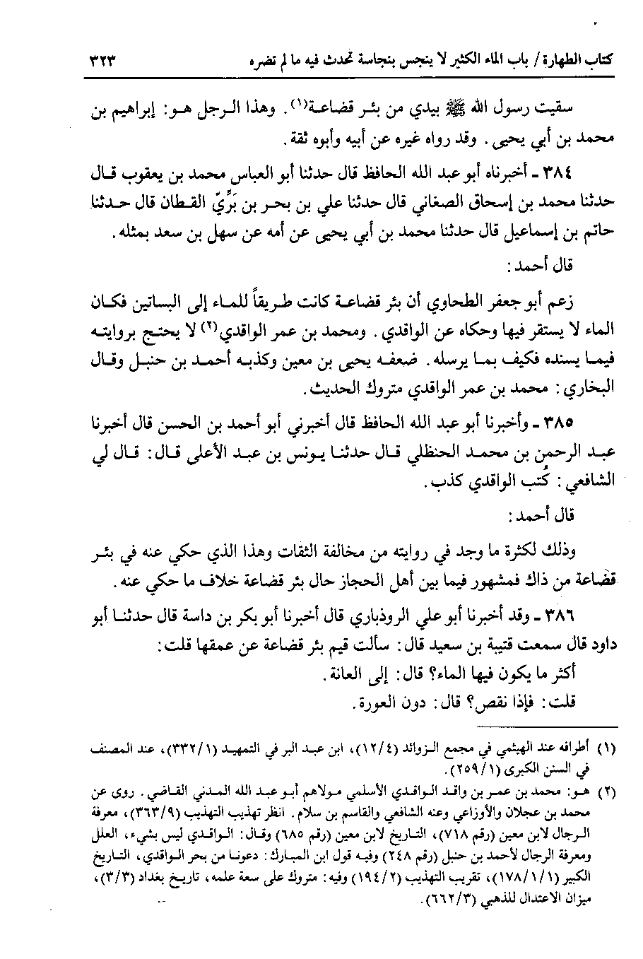 قال أحمد : زعم أبو جعفر الطحاوي أن بئر قضاعة كانت طريقا للماء إلى البساتين فكان الماء لا يستقر فيها وحكاه عن الوافدي . ومحمد بن عمر الواقدي لا يحتج بروايته فيما يسنده فكيف بما يرسله . ضعفه يحيى بن معين وكذبه أحمد بن حنبل وقال البخاري : محمد بن عمر الواقدي متروك الحديث.
