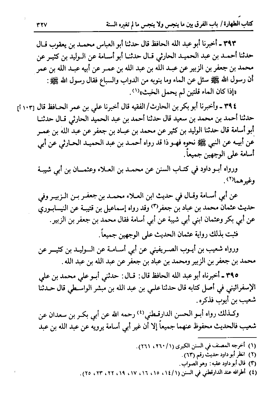 393 - أخبرنا أبو عبد الله الحافظ قال حدثنا أبو العباس محمد بن يعقوب قال حدثنا أحمد بن عبد الحميد الحارثي قال حدثنا أبو أسامة عن الوليد بن كثير عن محمد بن جعفر بن الزبير عن عبد الله بن عبد الله بن عمر عن أبيه عبد الله بن عمر أن رسول الله صلى الله عليه وسلم سئل عن الماء وما ينوبه من الدواب والسباع فقال رسول الله صلى الله عليه وسلم إذا كان الماء قلتين لم يحمل الخبث.