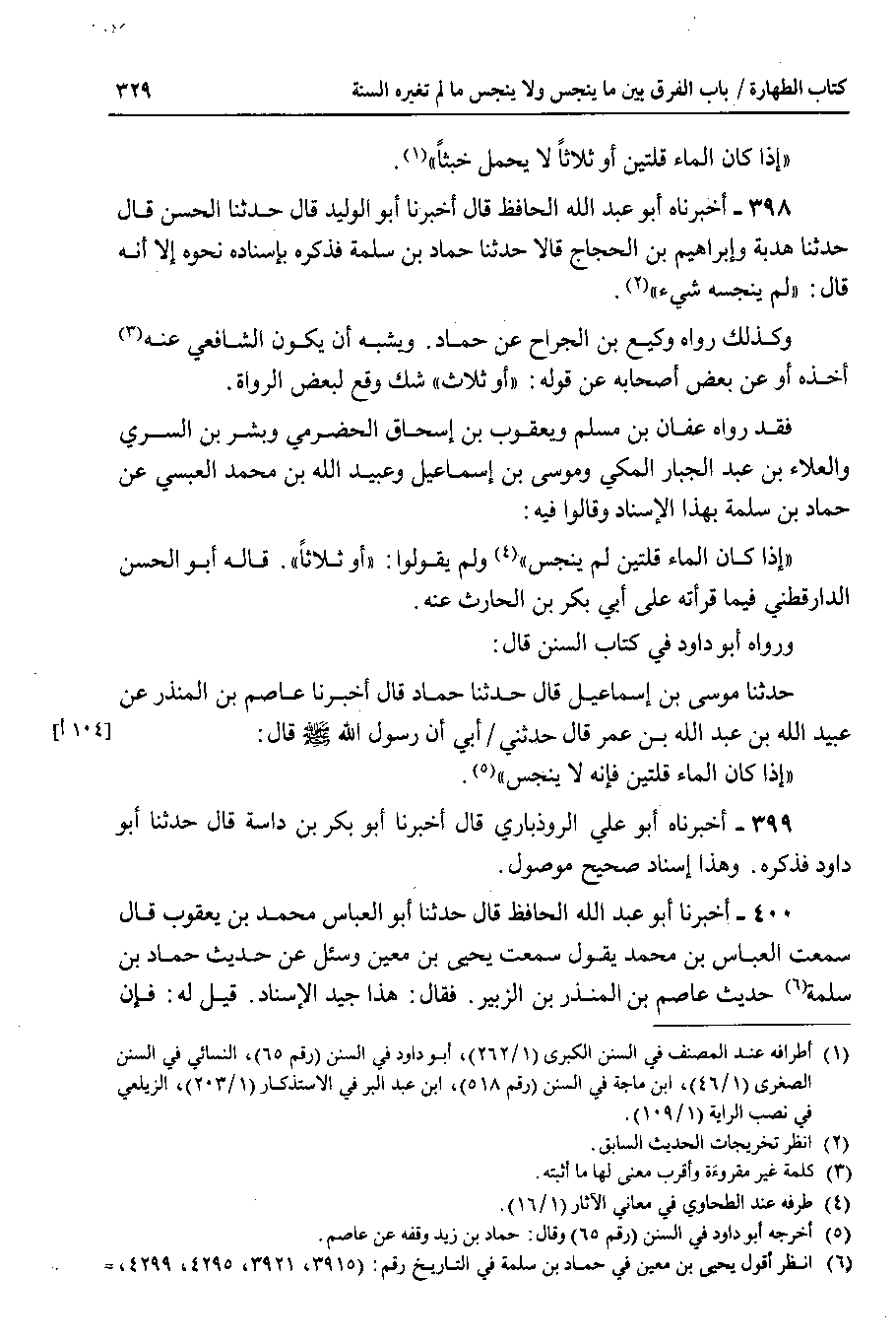فقد رواه عفان بن مسلم ويعقوب بن إسحاق الحضرمي وبشر بن السري والعلاء بن عبد الجبار المكي وموسى بن إسماعيل وعبيد الله بن محمد العبسي عن حماد بن سلمة بهذا الإسناد وقالوا فيه : إذا كان الماء قلتين لم ينجس ولم يقولوا : أو ثلاثا . قاله أبو الحسن الدارقطني فيما قرأته على أبي بكر بن الحارث عنه.