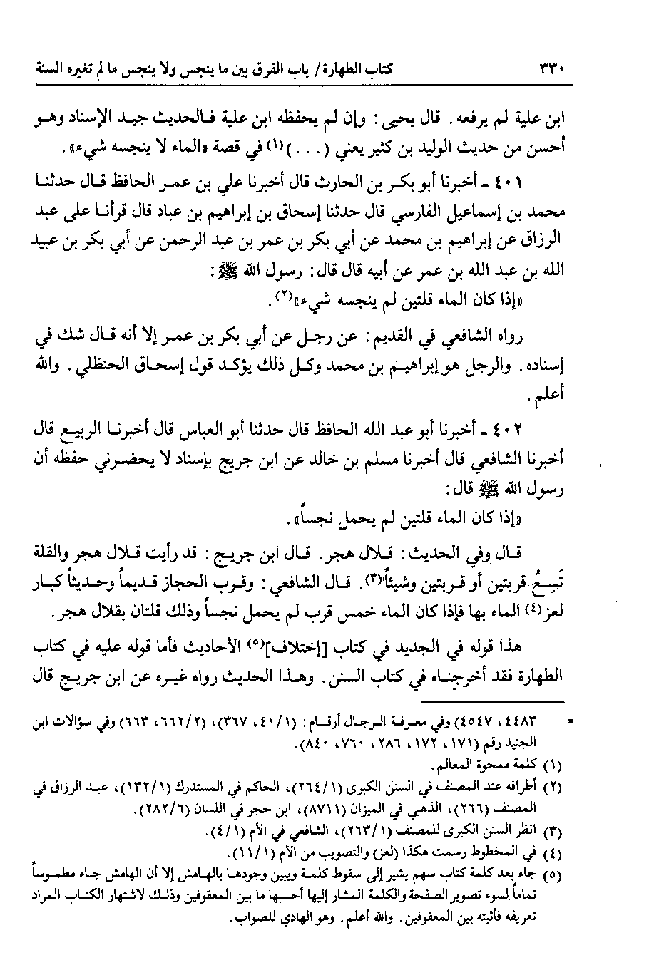 402 - أخبرنا أبو عبد الله الحافظ قال حدثنا أبو العباس قال أخبرنا الربيع قال : أَخْبَرَنَا الشافعي قال أخبرنا مسلم بن خالد عن ابن جريج بإسناد لا يحضرني حفظه أن رسول الله صلى الله عليه وسلم قال : إذا كان الماء قلتين لم يحمل نجسا.