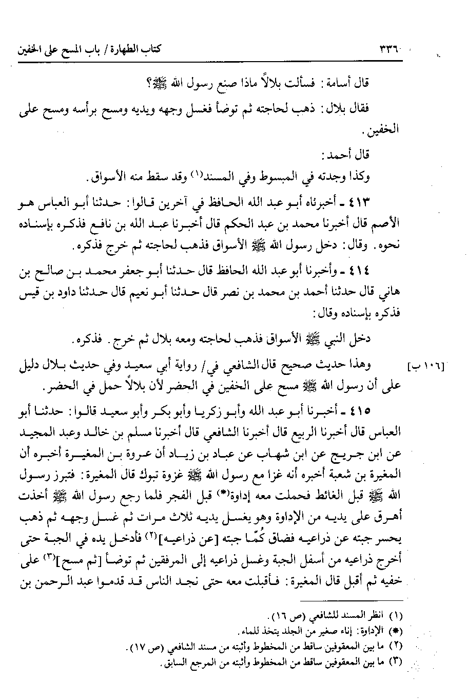 415 - أخبرنا أبو عبد الله وأبو زكريا وأبو بكر وأبو سعيد قالوا : حدثنا أبو العباس قال أخبرنا الربيع قال أخبرنا الشافعي قال أخبرنا مسلم بن خالد وعبد المجيد عن ابن جريج عن ابن شهاب عن عباد بن زياد أن عروة بن المغيرة أخبره أن المغيرة بن شعبة أخبره أنه غزا مع رسول الله صلى الله عليه وسلم غزوة تبوك قال المغيرة : فتبرز رسول الله قبل الغائط فحملت معه إداوة قبل الفجر فلما رجع رسول الله صلى الله عليه وسلم أخذت أهرق على يديه من الإداوة وهو يغسل يديه ثلاث مرات ثم غسل وجهه ثم ذهب يحسر جبته عن ذراعيه فضاق كما جبته عن ذراعيه فأدخل يده في الجبة حتى أخرج ذراعيه من أسفل الجبة وغسل ذراعيه إلى المرفقين ثم توضأ ثم مسح على خفيه ثم أقبل قال المغيرة : فاقبلت معه حتى نجد الناس قد قدموا عبد الرحمن بن
