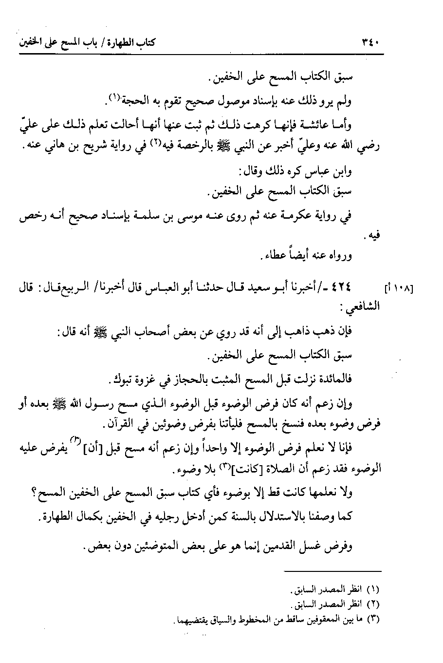 424 - أخبرنا أبو سعيد قال حدثنا أبو العباس قال أخبرنا الربيع قال : قال الشافعي : فإن ذهب ذاهب إلى أنه قد روي عن بعض أصحاب النبي صلى الله عليه وسلم أنه قال : سبق الكتاب المسح على الخفين.