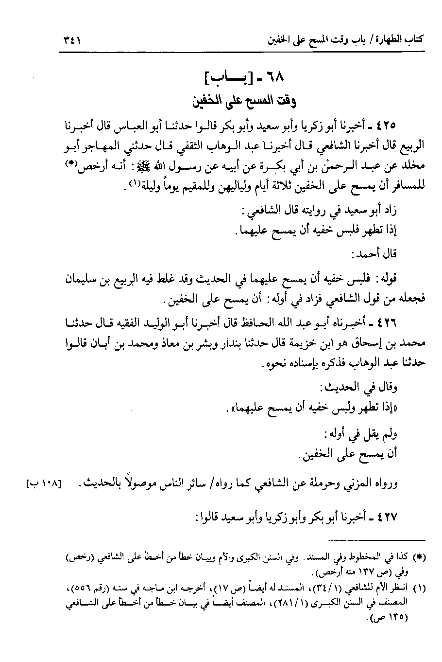 425 - أخبرنا أبو زكريا وأبو سعيد وأبو بكر قالوا حدثنا أبو العباس قال أخبرنا الربيع قال أخبرنا الشافعي قال أخبرنا عبد الوهاب الثقفي قال حدثني المهاجر أبو مخلد عن عبد الرحمن بن أبي بكرة عن أبيه عن رسول الله صلى الله عليه وسلم : أنه أرخص للمسافر أن يمسح على الخفين ثلاثة أيام ولياليهن وللمقيم يوما وليلة.