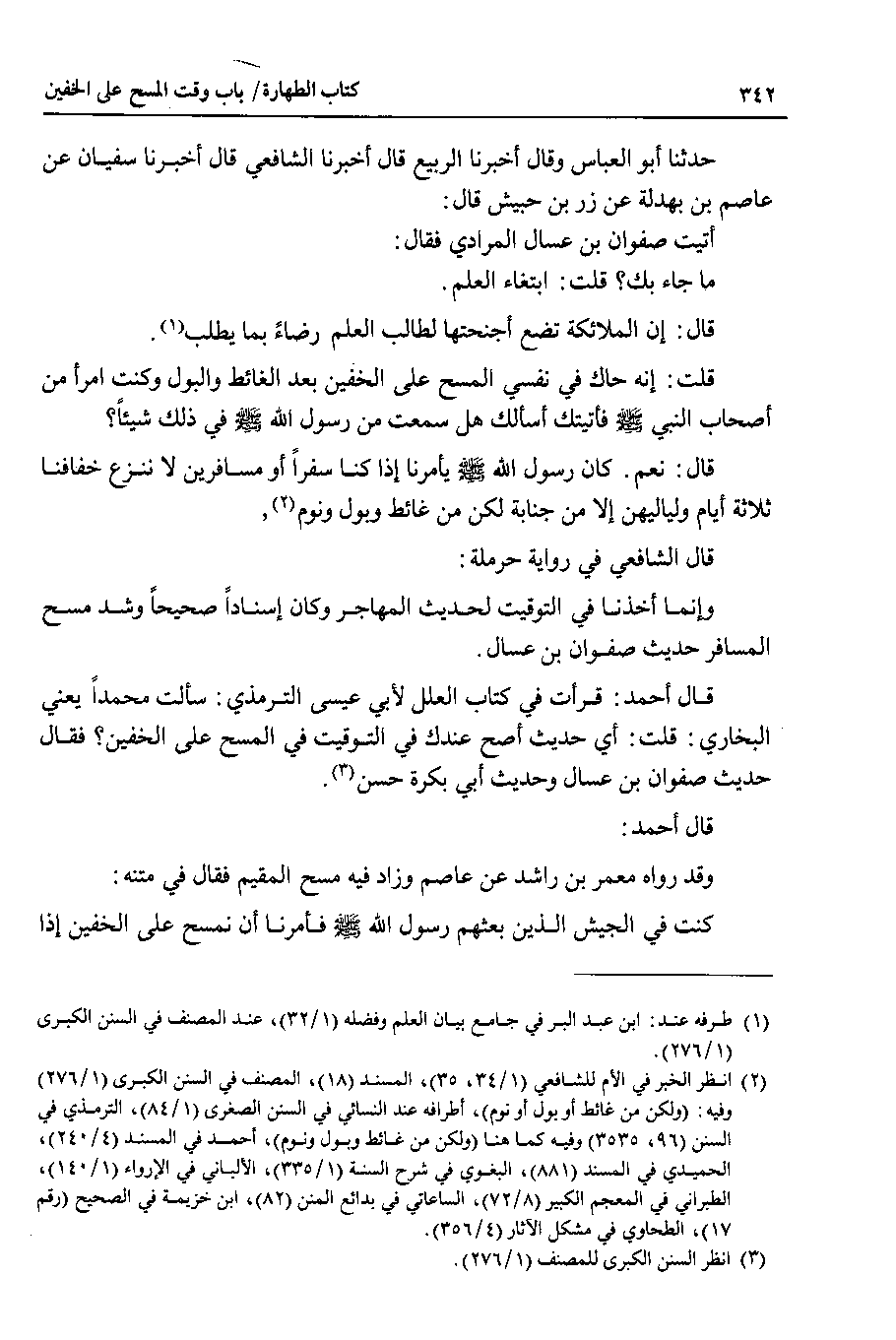 وإنما أخذنا في التوقيت لحديث المهاجر وكان إسنادا صحيحا وشد مسح المسافر حديث صفوان بن عسال.